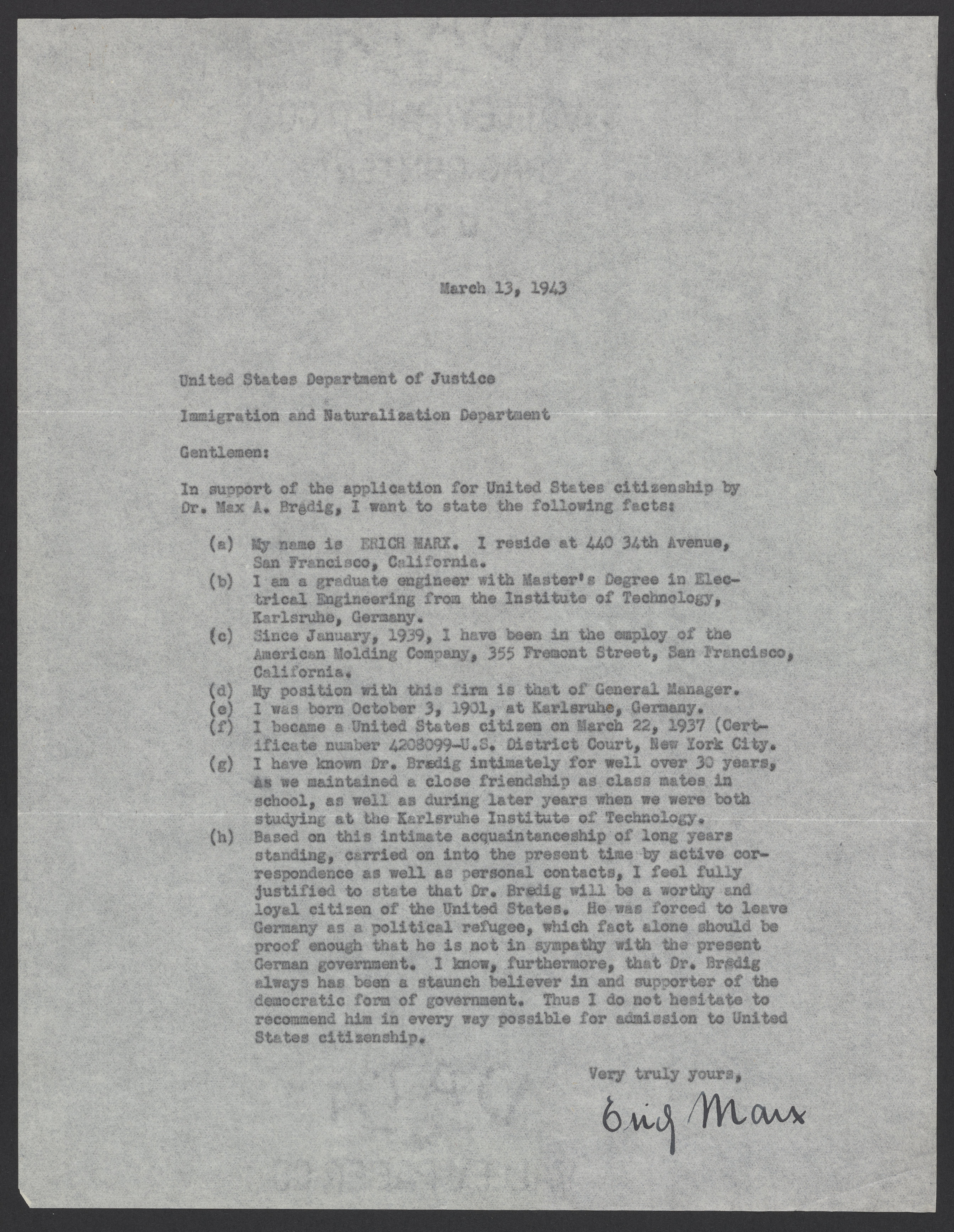 Small JPG1200 x 1549px — 361 KBLarge JPG2880 x 3718px — 2.4 MBFull-sized JPG5372 x 6936px — 7.7 MBOriginal fileTIFF — 5372 x 6936px — 107 MBTestimony from Erich Marx (1901-1990) for Max Albert Bredig's (1902-1977) petition for naturalization.