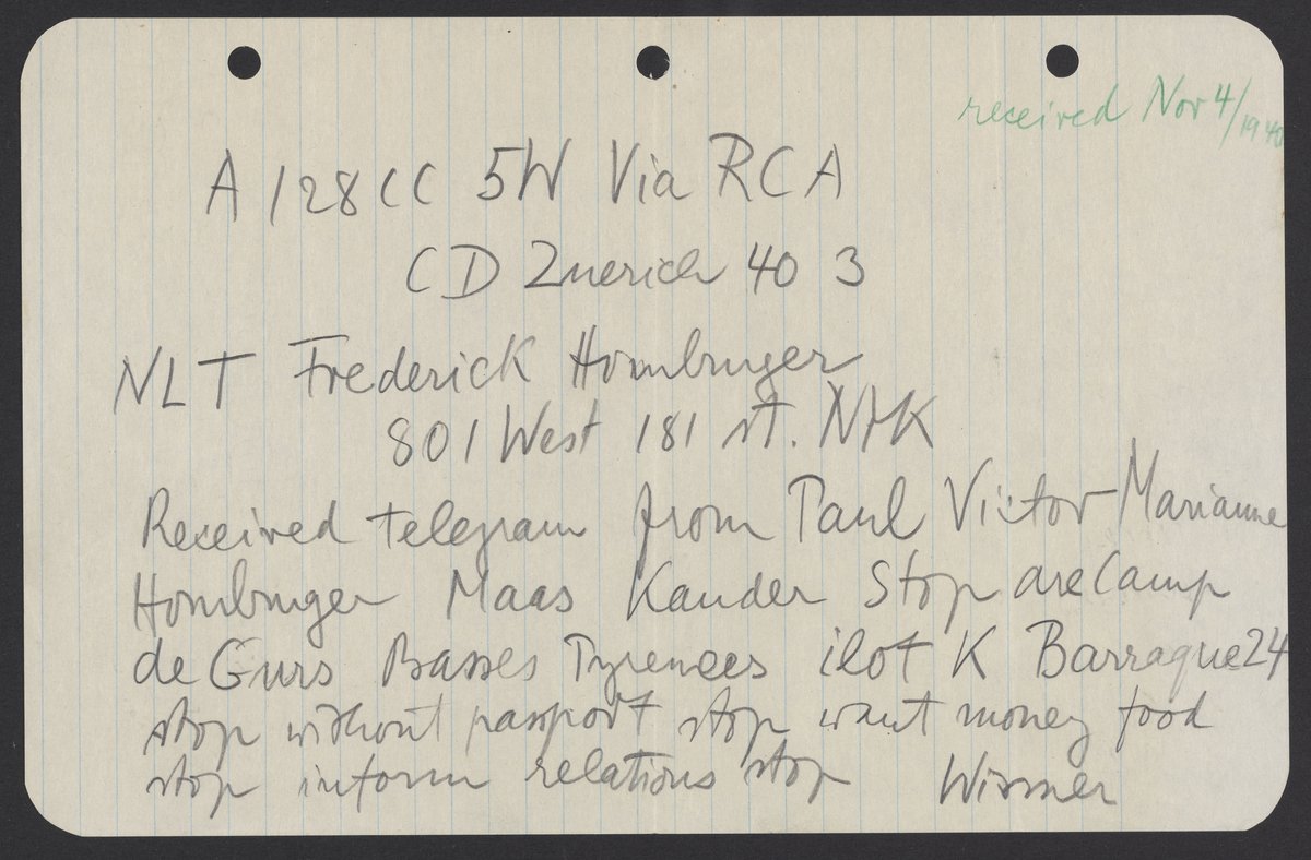 Small JPG1200 x 788px — 145 KBLarge JPG2880 x 1892px — 803 KBFull-sized JPG5403 x 3550px — 2.7 MBOriginal fileTIFF — 5403 x 3550px — 54.9 MBHandwritten copy of a telegram originally sent to Frederick Homburger (1918-2006). The author tells Homburger that his family is at the Gurs internment camp and needs passports, money, and food.