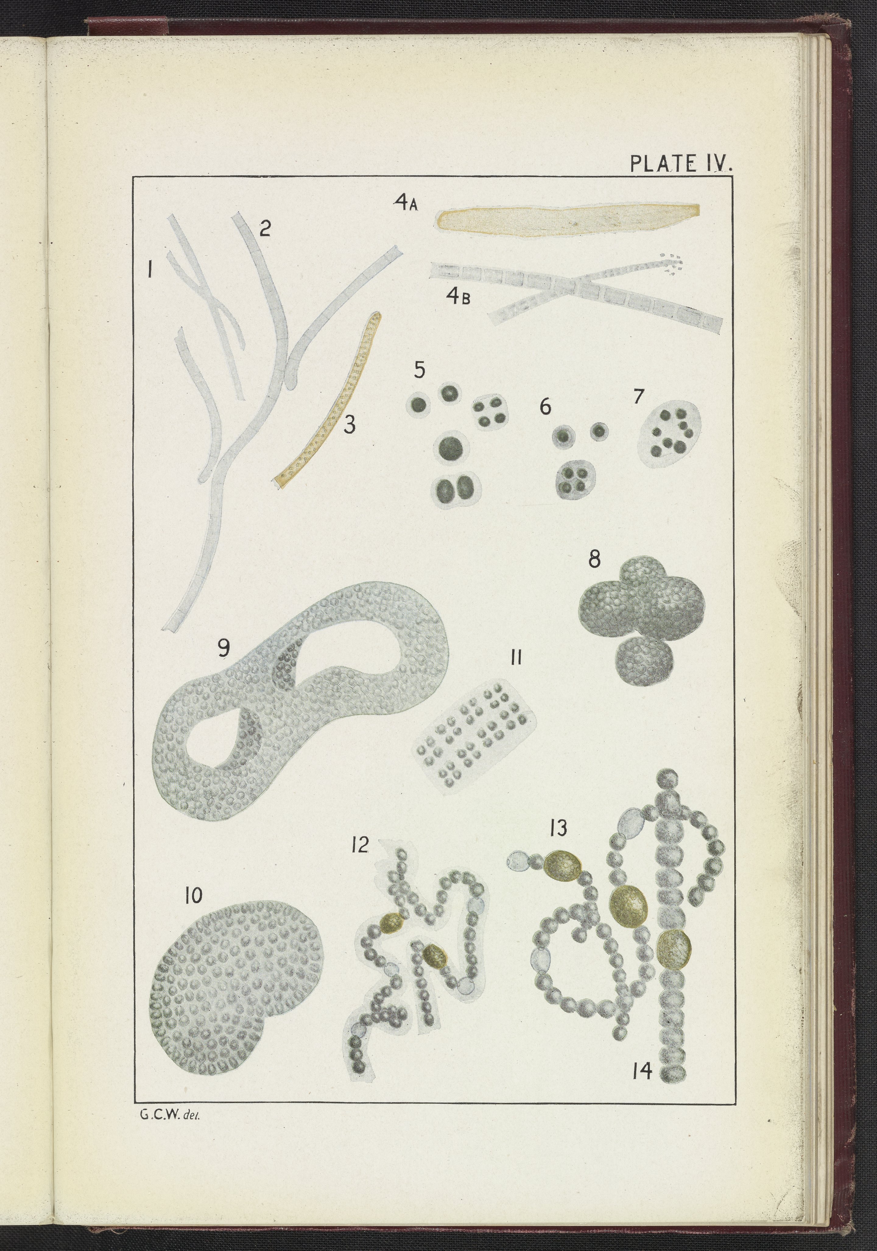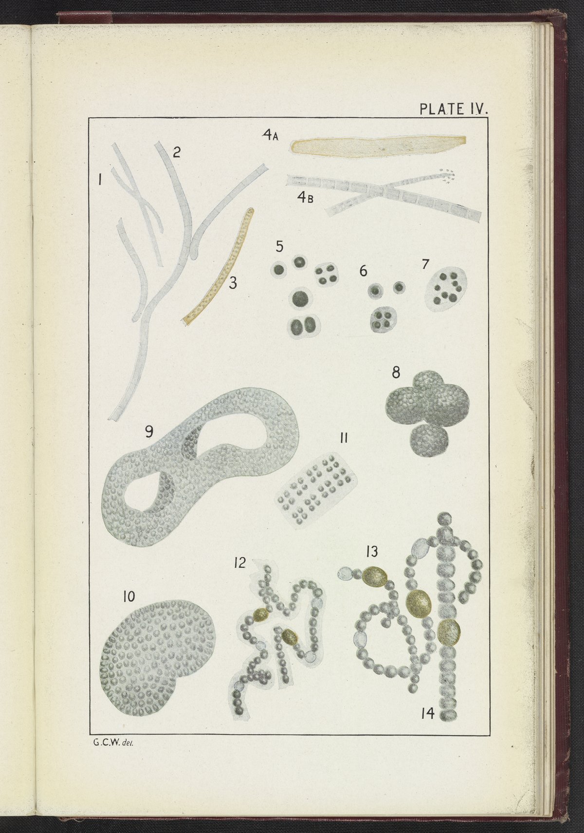 Whipple, George Chandler. “Plate IV: Schizophyceæ.” The Microscopy of Drinking Water, 1914. https://digital.sciencehistory.org/works/8336h283c.