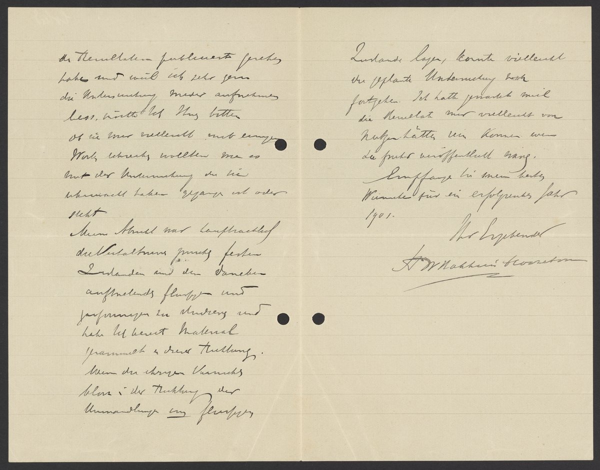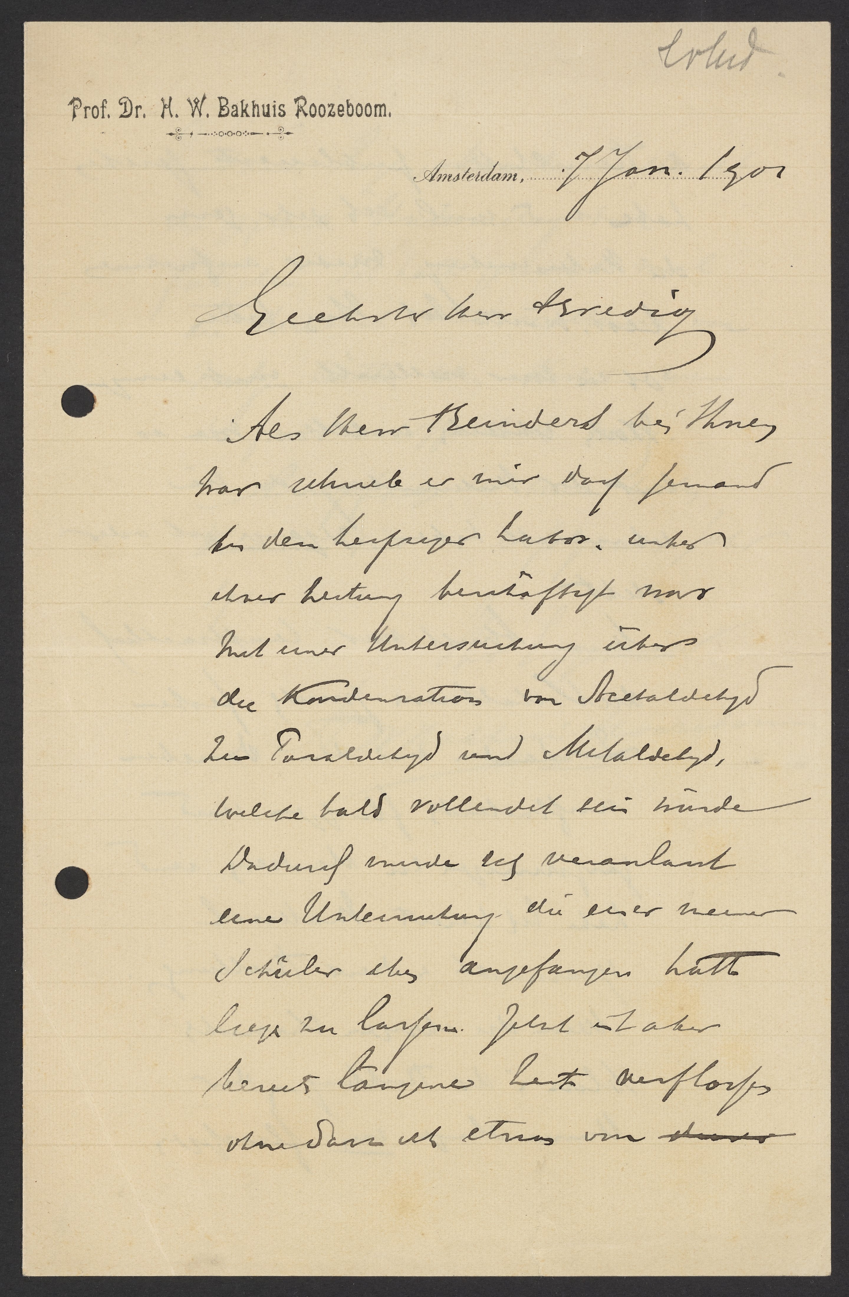 Bakhuis Roozeboom, Hendrik Willem. “Letter from Hendrik Willem Bakhuis Roozeboom to Georg Bredig, January 1901,” January 7, 1901. Papers of Georg and Max Bredig, Box 2, Folder 43. Science History Institute. Philadelphia. https://digital.sciencehistory.org/works/855a9eg.