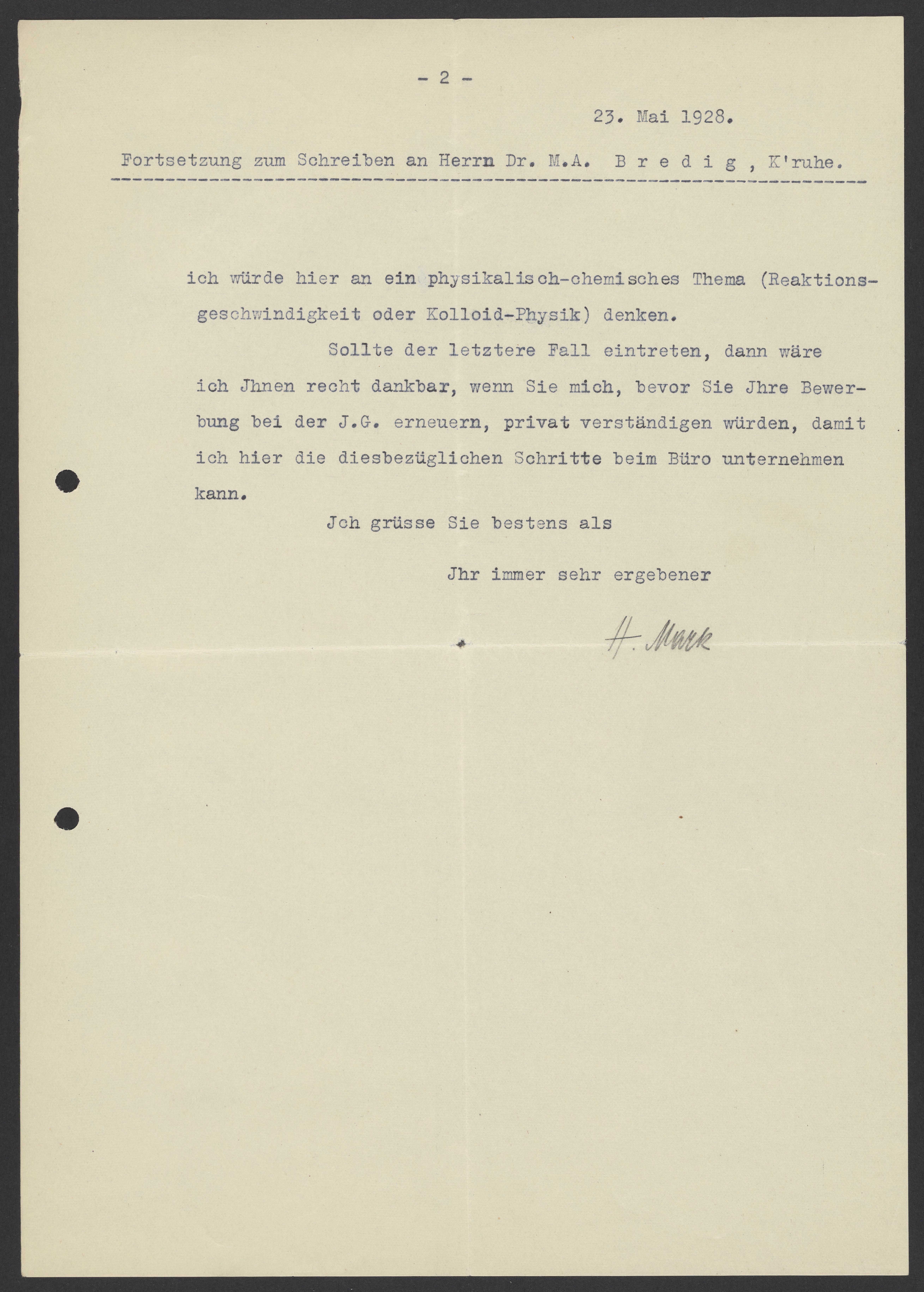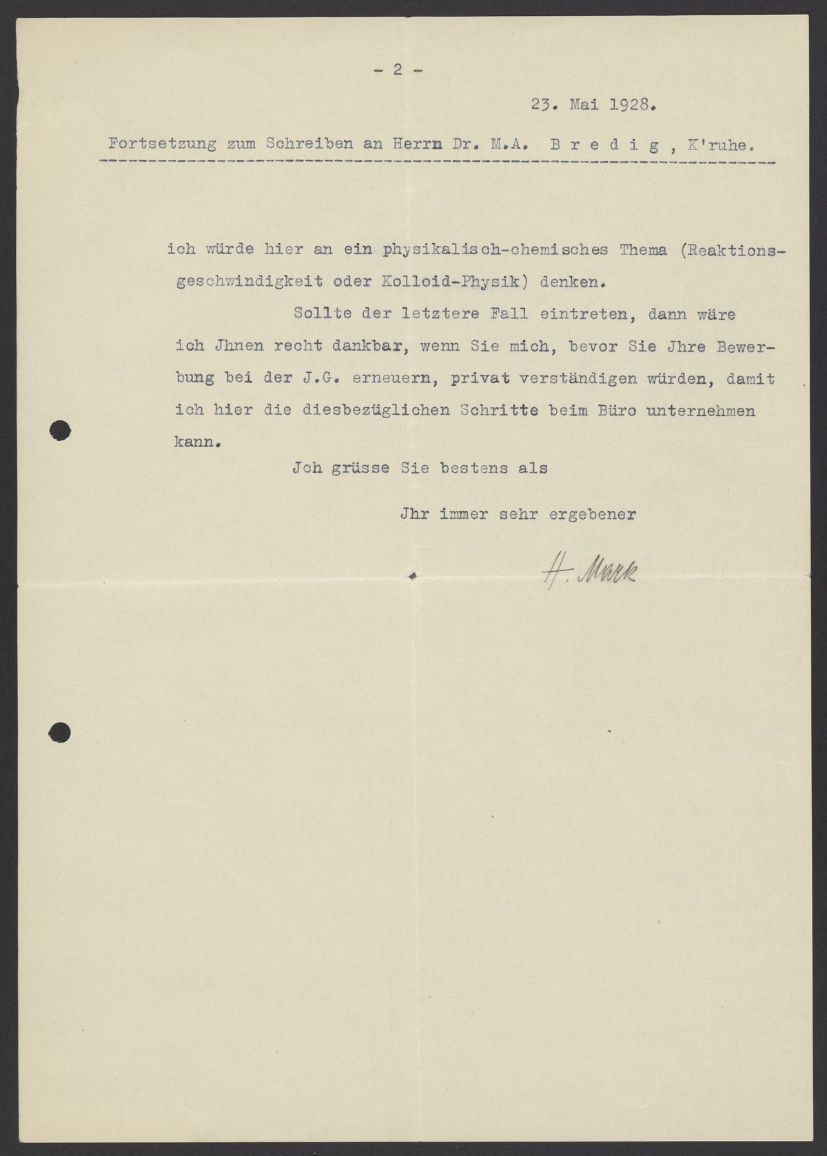 Small JPG1200 x 1682px — 262 KBLarge JPG2880 x 4037px — 1.4 MBFull-sized JPG5240 x 7346px — 4.4 MBOriginal fileTIFF — 5240 x 7346px — 110 MBHerman Francis Mark (1895-1992), an Austrian chemist known for his contributions to polymer science, X-ray diffraction, and his work at IG Farben, describes a position that he would like to offer Max Bredig (1902-1977) in his laboratory.