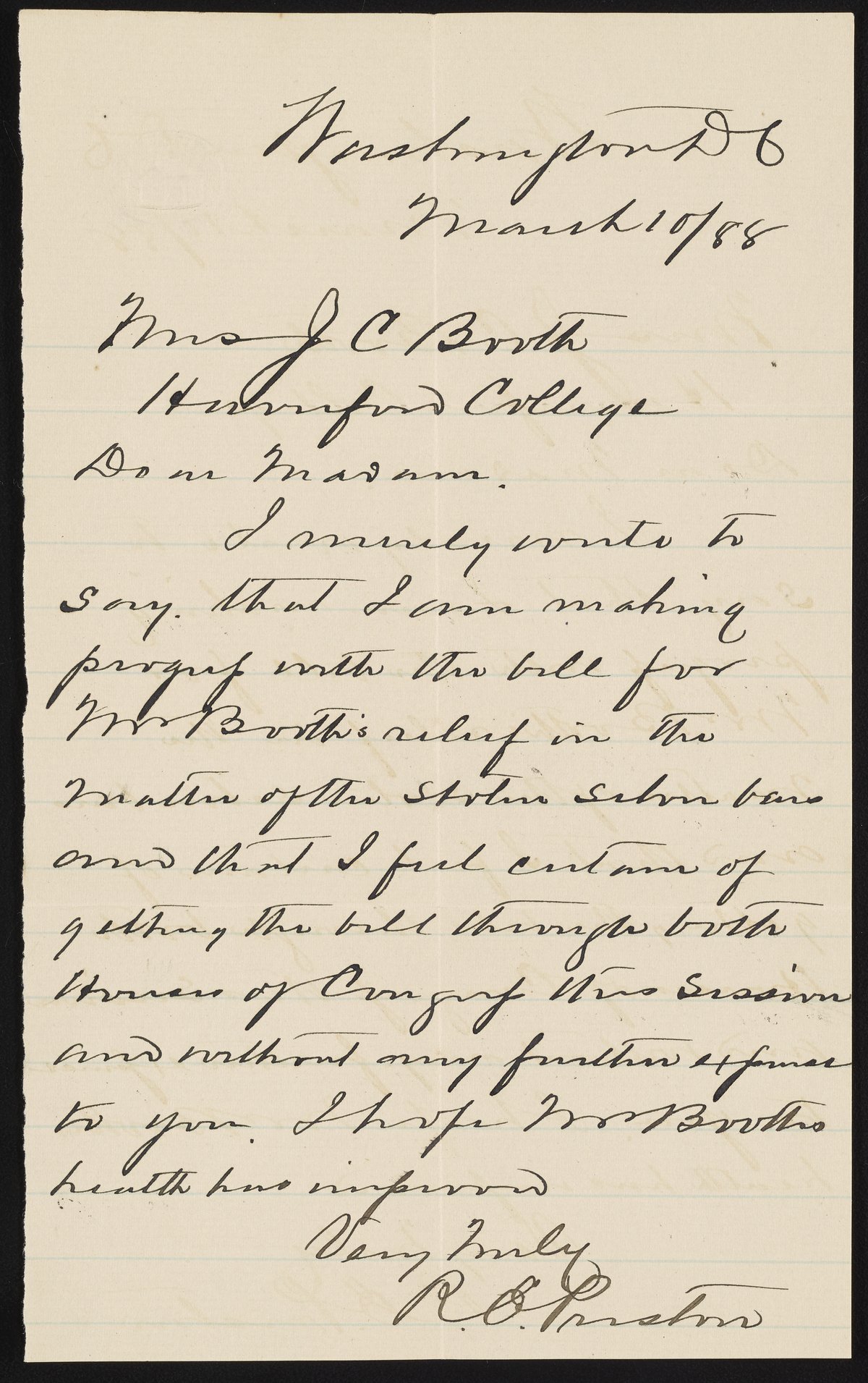 Letter from R.E. Preston to Margaret M. Booth, March 10, 1888
