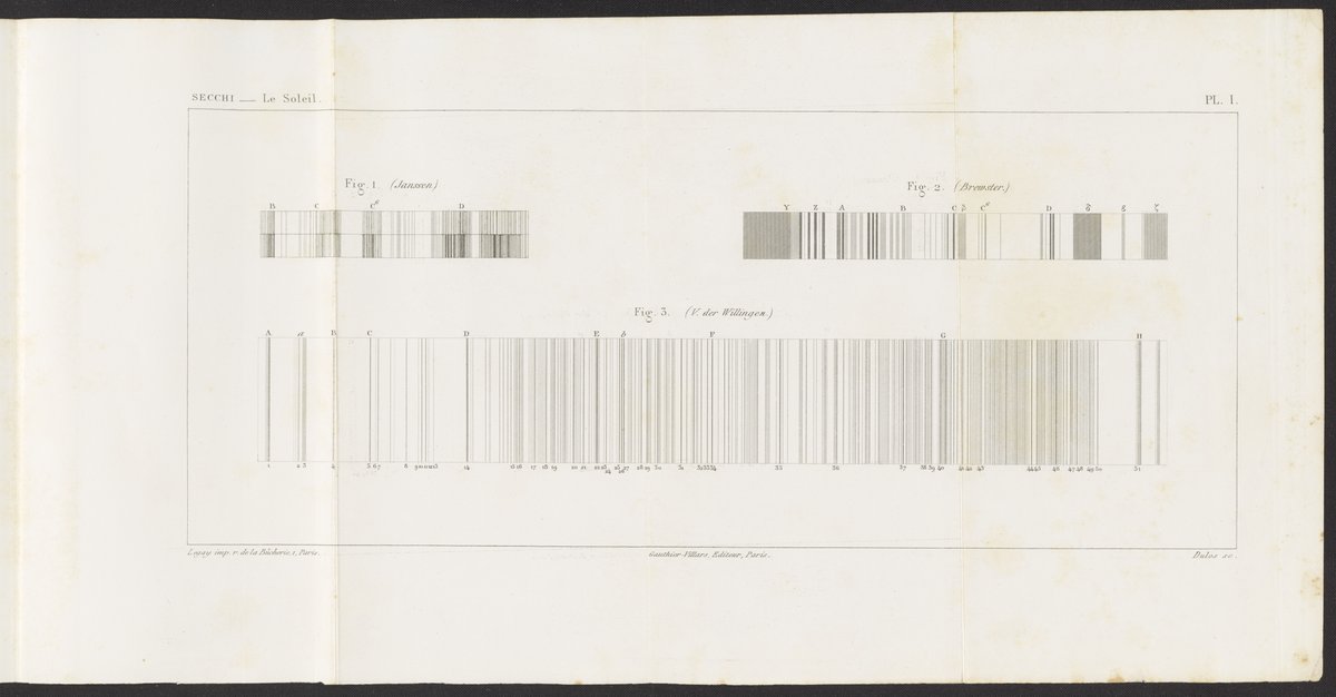 Secchi, Angelo. “Plate 1: Solar Spectra.” In Le Soleil: Exposé Des Principales Découvertes Modernes Sur La Structure De Cet Astre, Son Influence Dans l'Univers Et Ses Relations Avec Les Autres Corps Célestes. Paris, France: Gauthier-Villars, 1870. https://digital.sciencehistory.org/works/8623hx75j.