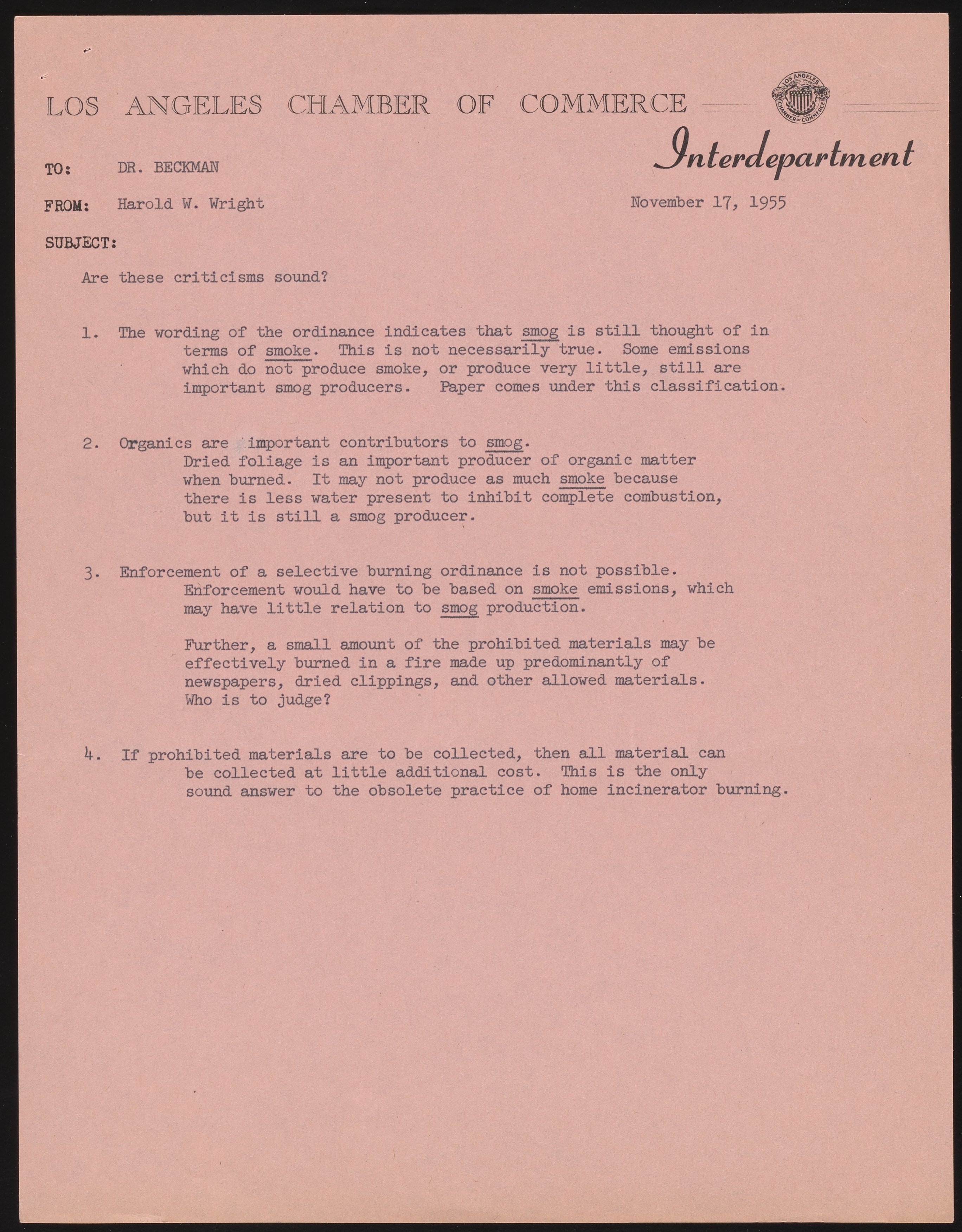 Memo regarding criticisms of Regulation VII, an ordinance proposed by the Los Angeles Chamber of Commerce's Air Pollution Committee to control Los Angeles smog. Among the criticisms: the difference between smoke and smog, the difficulty of enforcing burning regulations, and the cost of collecting prohibited burning materials.