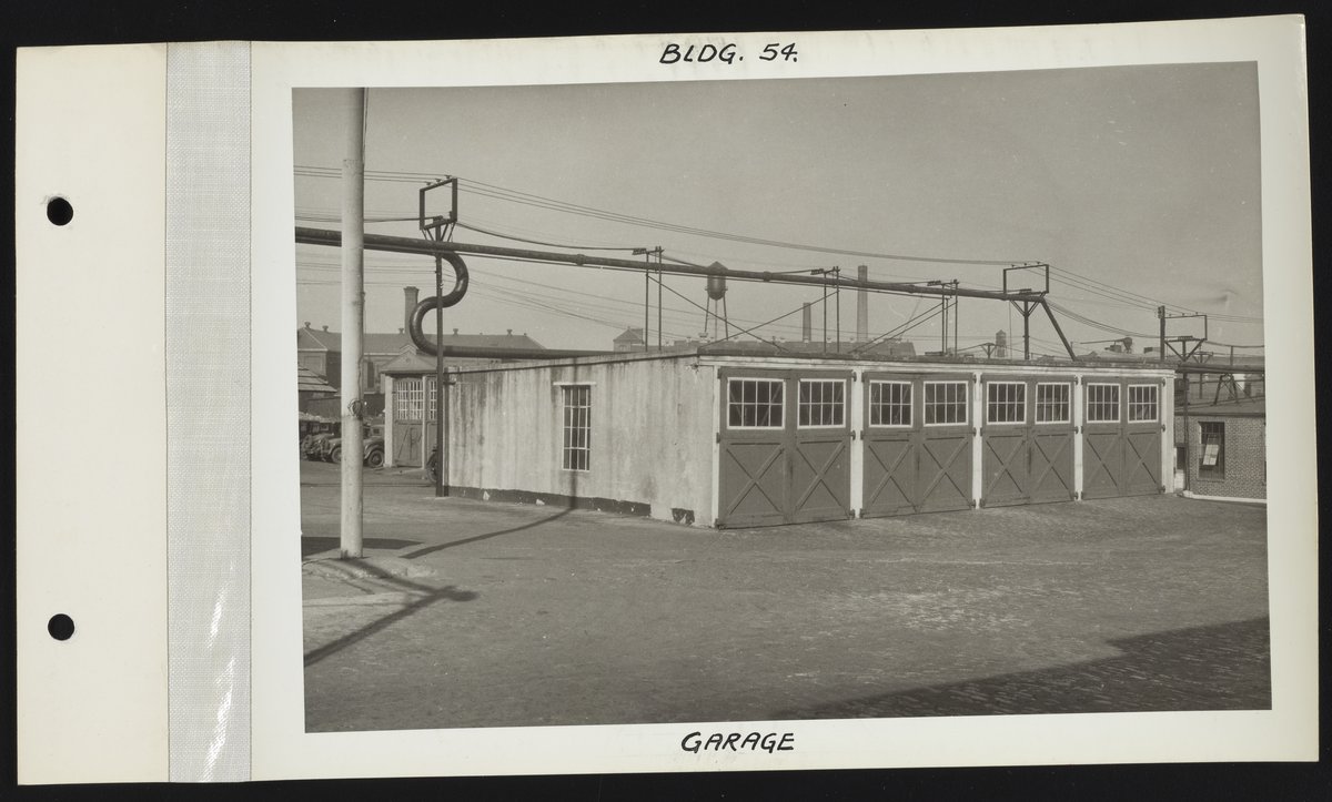 General view of the exterior of the garage (Building 54) at the Charles Lennig and Company chemical manufacturing plant in Bridesburg, a neighborhood located along the Delaware River in the Northeast section of Philadelphia, Pennsylvania. Charles Lennig and Company operated as a subsidiary of the Rohm and Haas Company, an international chemical company headquartered in Philadelphia, from 1920 to 1947.