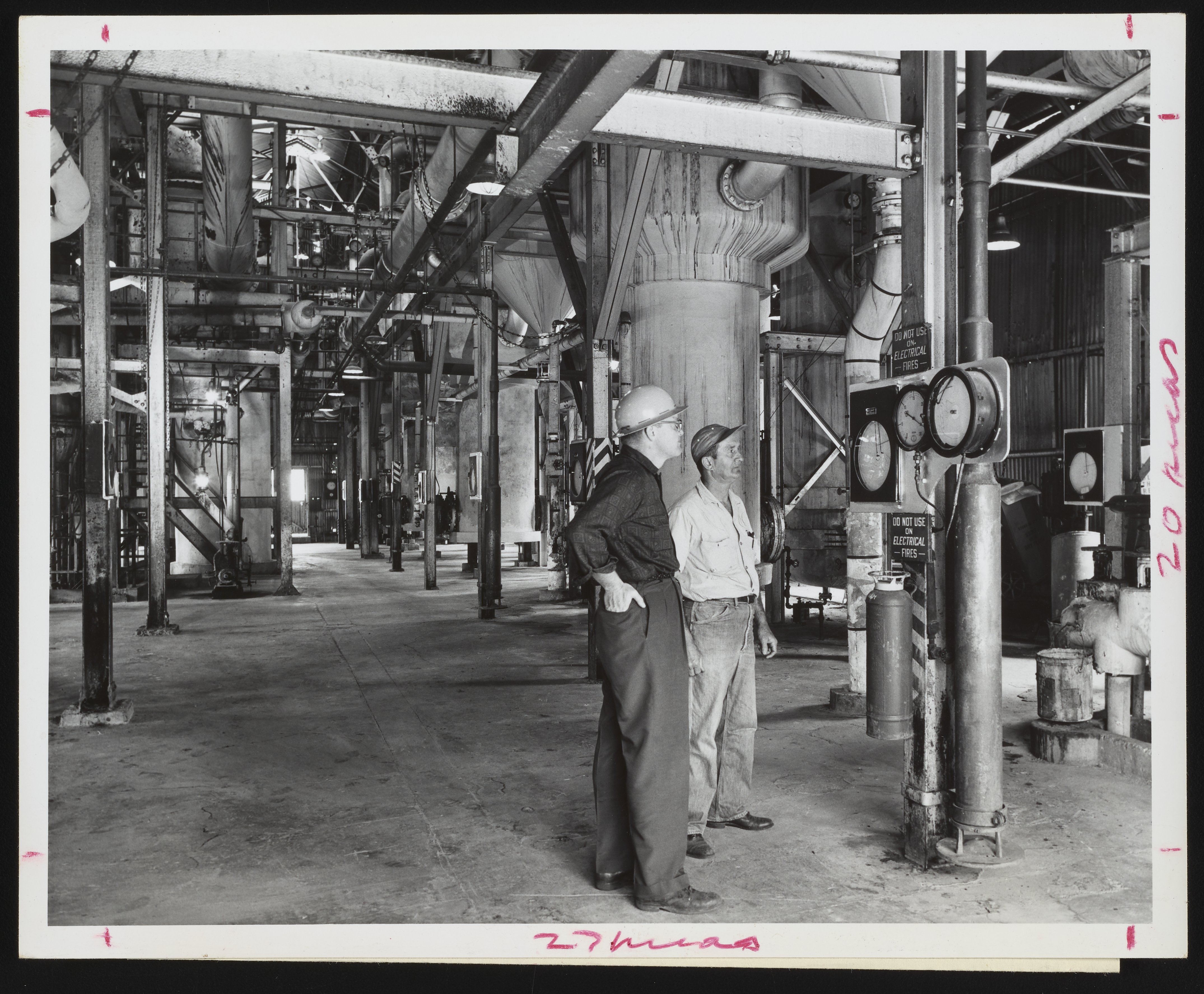 Hercules Incorporated. “Stan Fenelon and Clarence Darley Examining Rosin Solution Evaporator at Hercules Brunswick Plant,” circa 1960. Photographs from the Records & Ephemera of Hercules Incorporated, Box 1, Folder 6. Science History Institute. Philadelphia. https://digital.sciencehistory.org/works/8623hz62p.