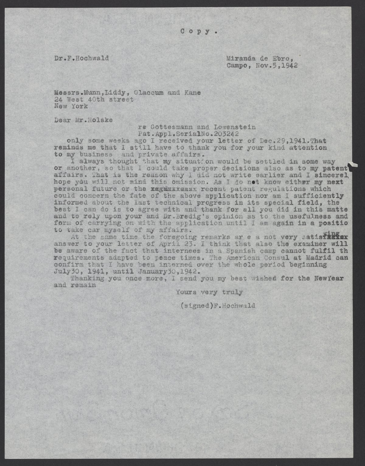 Fritz Hochwald (1897-1968) writes to Clarence. E. Holske of Munn, Liddy, Glaccum, and Kane, a New York-based law firm, regarding Hochwald's patent applications. At this time Hochwald is again detained at the Miranda de Ebro concentration camp in Burgos, Spain.