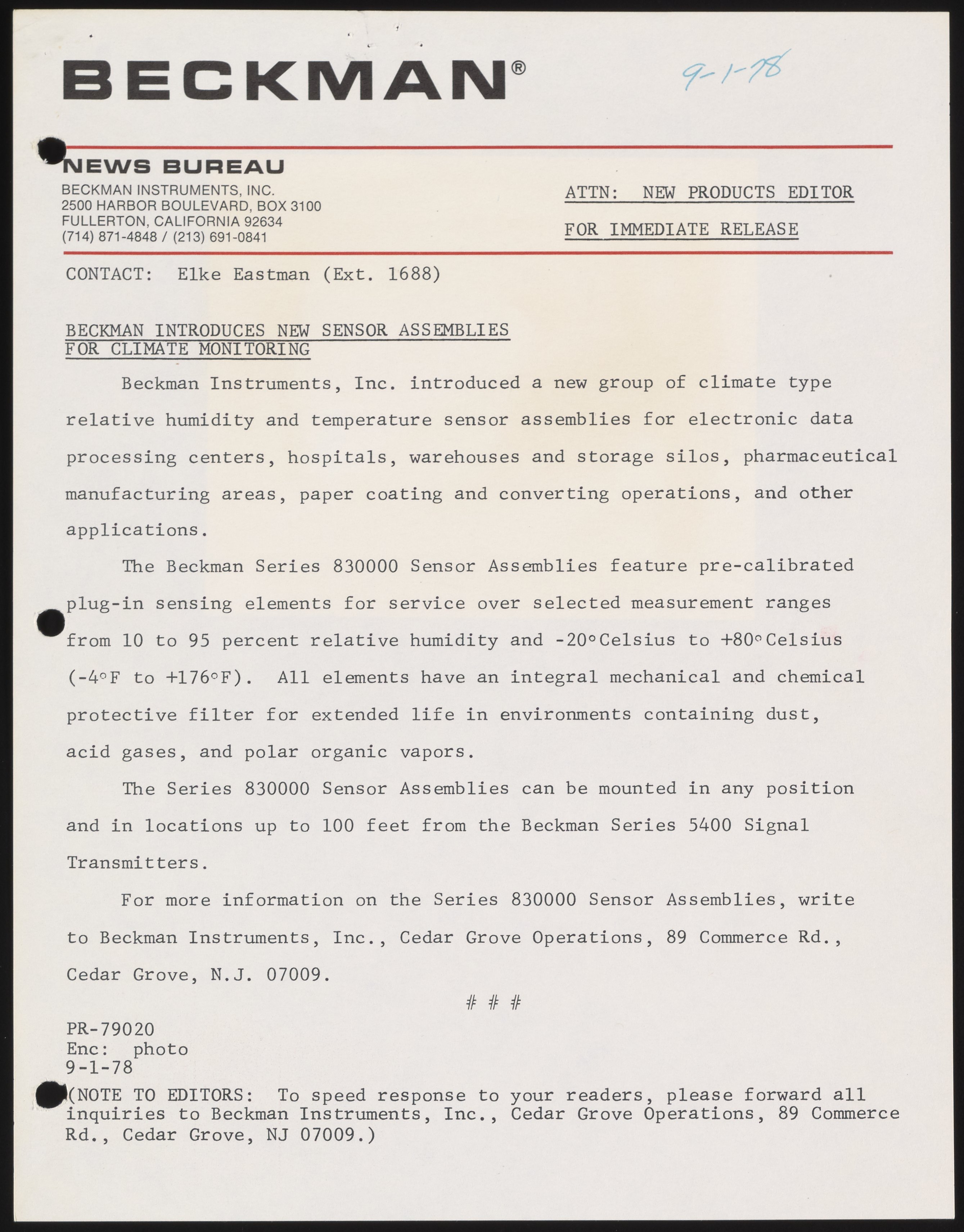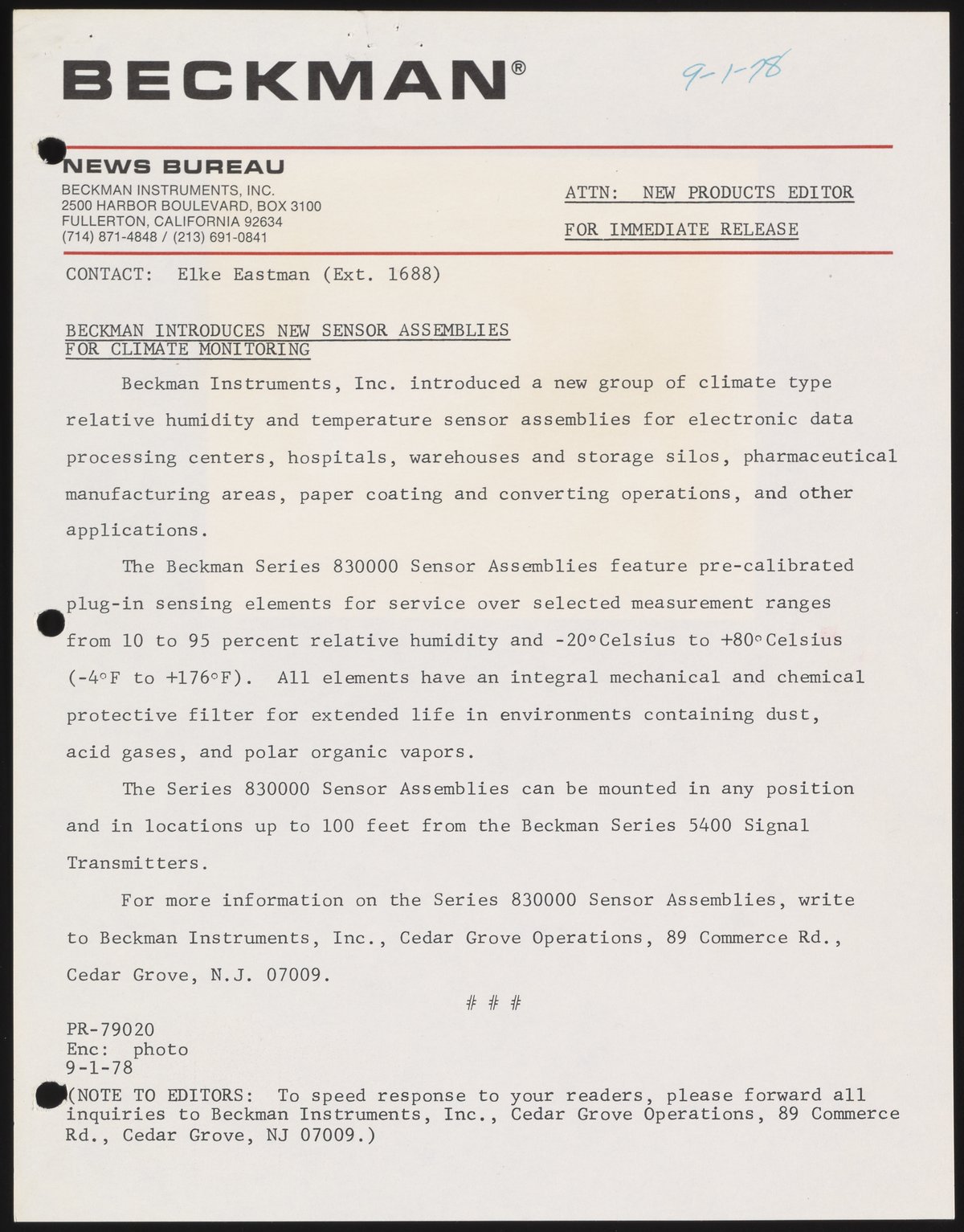 Eastman, Elke. “Beckman Introduces New Sensor Assemblies for Climate Monitoring,” September 1, 1978. Beckman Historical Collection, Box 58, Folder 67. Science History Institute. Philadelphia. https://digital.sciencehistory.org/works/8910jv09d.