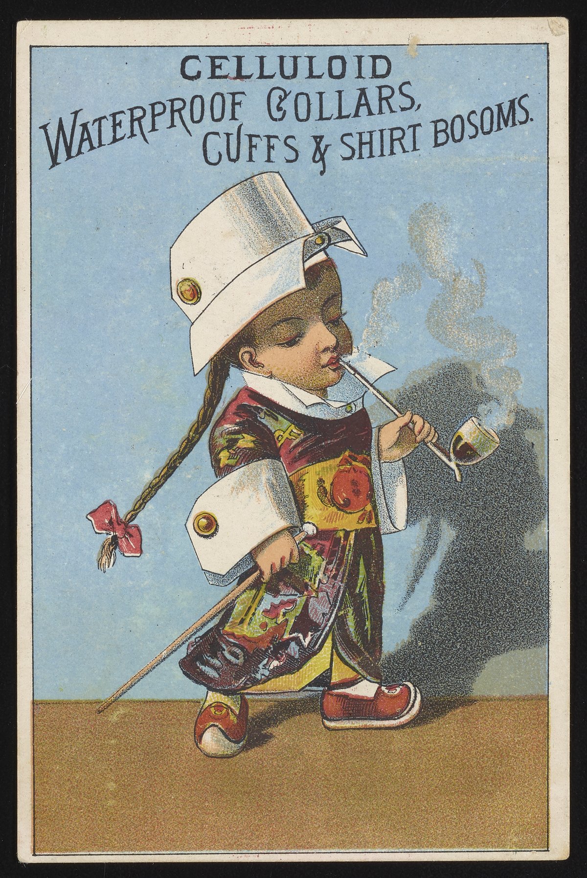 “Trade Card for Celluloid Waterproof Collars, Cuffs, and Shirt Bosoms.” Lithographic ink, circa 1890. Science History Institute. Philadelphia. https://digital.sciencehistory.org/works/8910jv725.