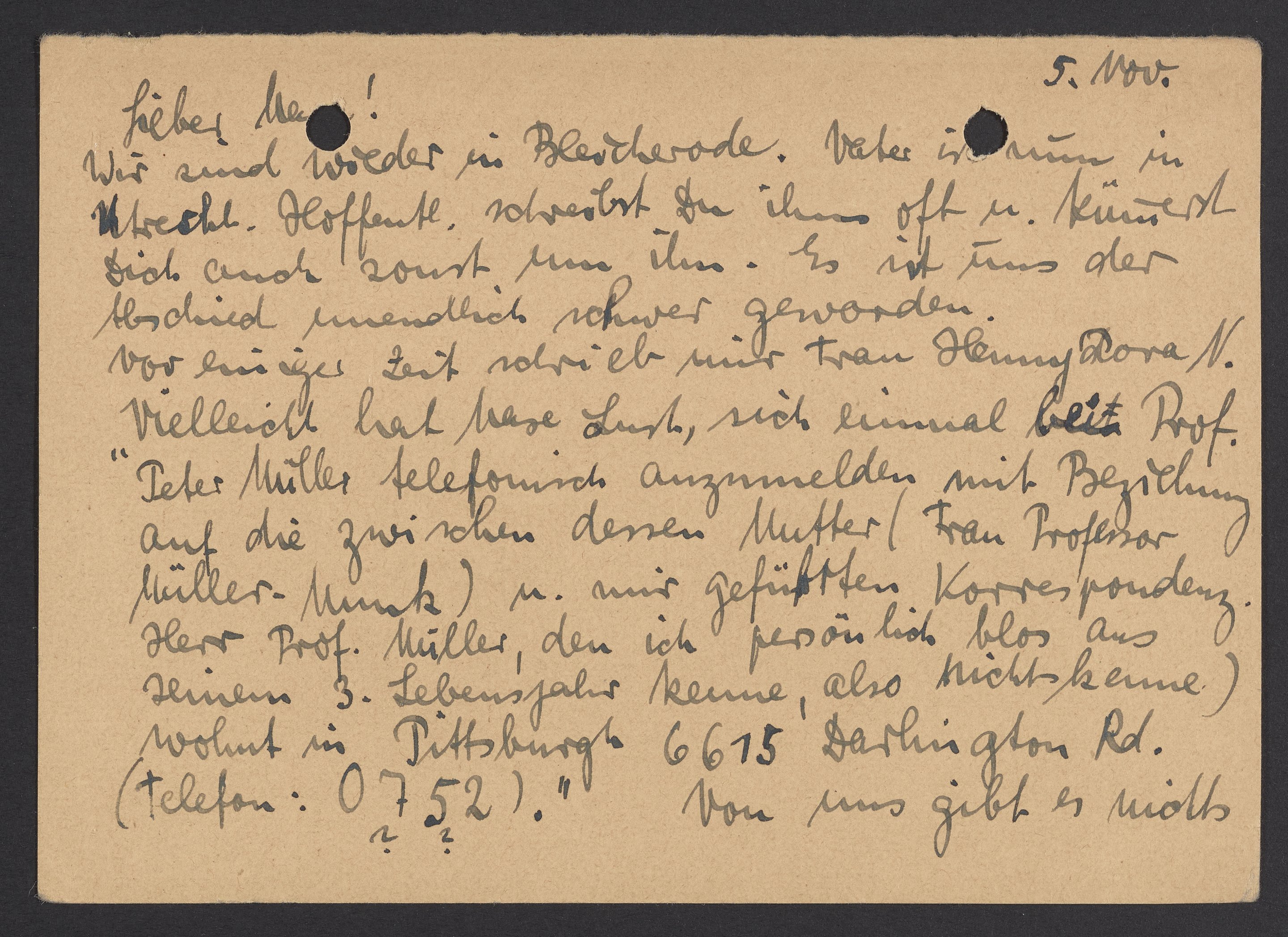 Wir sind wieder in Bleicherode. Vater ist nun in Utrecht. Hoffentlich schreibst Du ihn oft und kümmerst Du auch sonst um ihn. Es ist uns der Abschied unendlich schwer geworden. Vor einiger Zeit schrieb mir Frau Henry Dora. Vielleicht hat Vater Lust, sich einmal bei Prof. “Peter Müller telefonisch anzumelden mit Beziehung auf die zwischen dessen Mutter (Frau Professor Müller-Munk) u. mir geführten Korrespondenz. Herr Prof. Müller, den ich persönlich blos aus seinem 3. Lebensjahr kenne, also nicht kenne) wohnt in Pittsburgh, 6615 Darlington Rd. (Telefon: 0752).” Von uns gibt es nichts