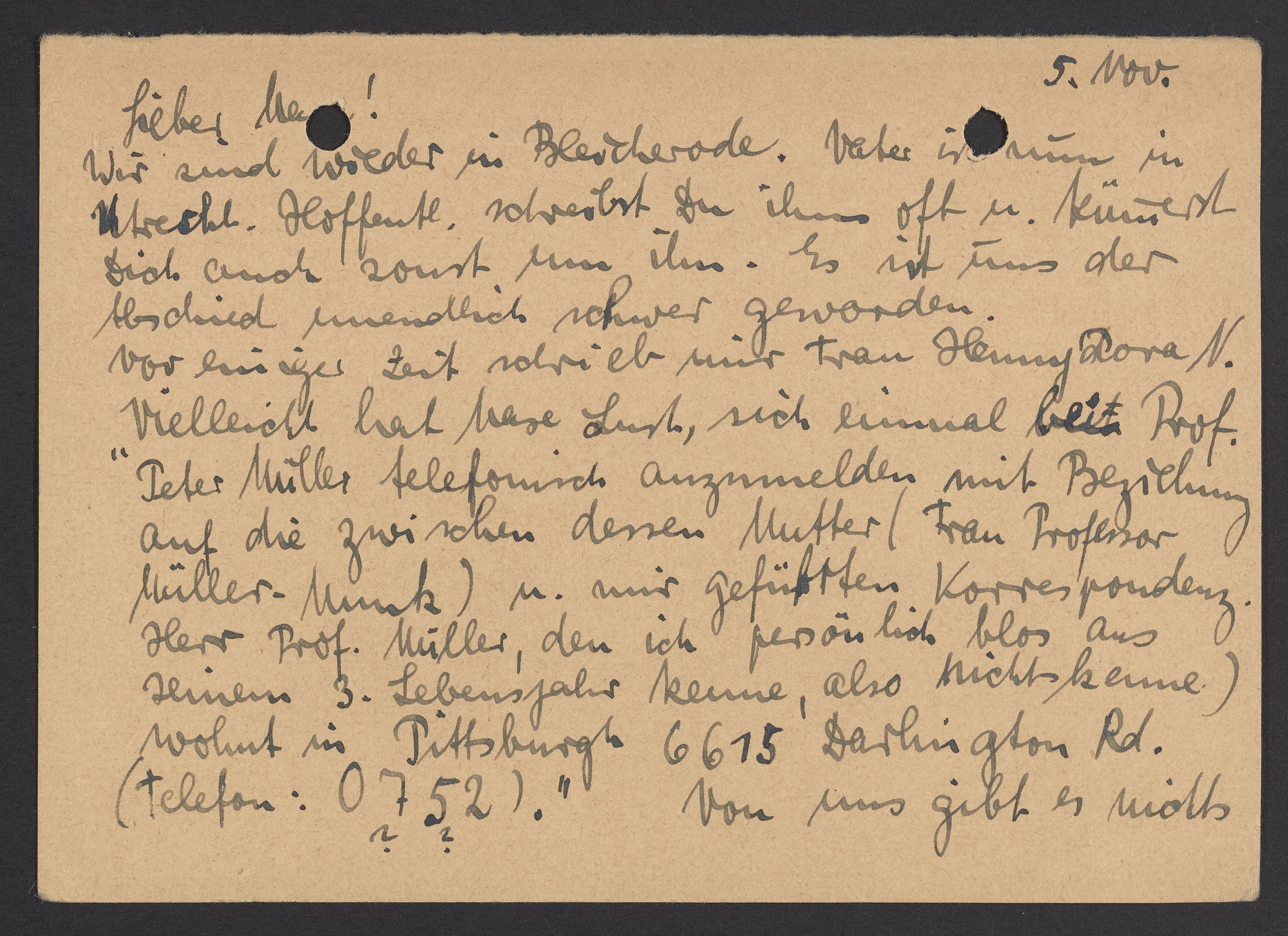 Wir sind wieder in Bleicherode. Vater ist nun in Utrecht. Hoffentlich schreibst Du ihn oft und kümmerst Du auch sonst um ihn. Es ist uns der Abschied unendlich schwer geworden. Vor einiger Zeit schrieb mir Frau Henry Dora. Vielleicht hat Vater Lust, sich einmal bei Prof. “Peter Müller telefonisch anzumelden mit Beziehung auf die zwischen dessen Mutter (Frau Professor Müller-Munk) u. mir geführten Korrespondenz. Herr Prof. Müller, den ich persönlich blos aus seinem 3. Lebensjahr kenne, also nicht kenne) wohnt in Pittsburgh, 6615 Darlington Rd. (Telefon: 0752).” Von uns gibt es nichts