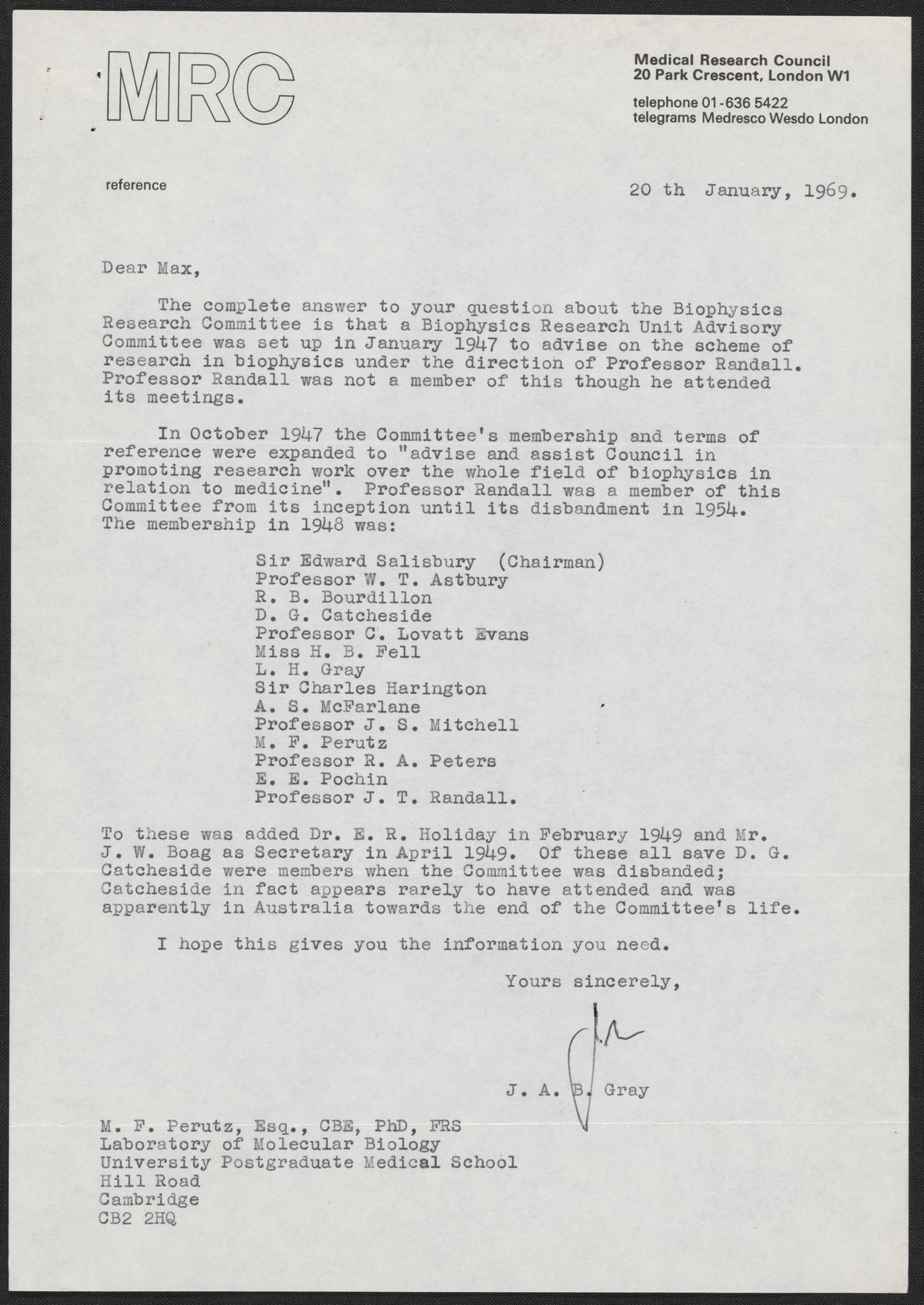 Gray, J. A. B. (John Archibald Browne). “Letter from J. A. B. Gray to Max Perutz, January 20, 1969,” January 20, 1969. History of Molecular Biology Collection, Box 88, Folder 3. Science History Institute. Philadelphia. https://digital.sciencehistory.org/works/8a4g3s9.