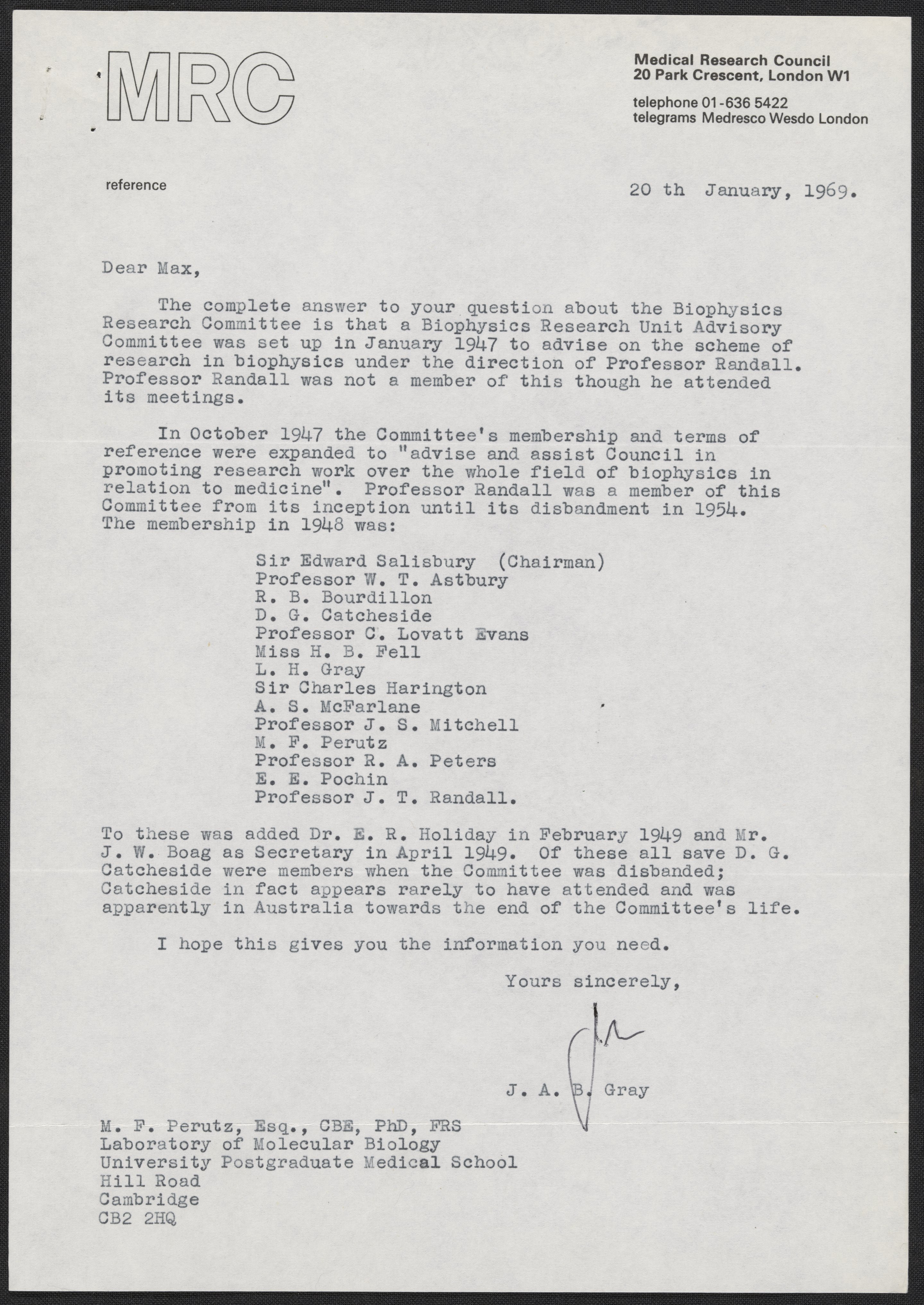 Letter from J. A. B. Gray to Max Perutz, January 20, 1969
