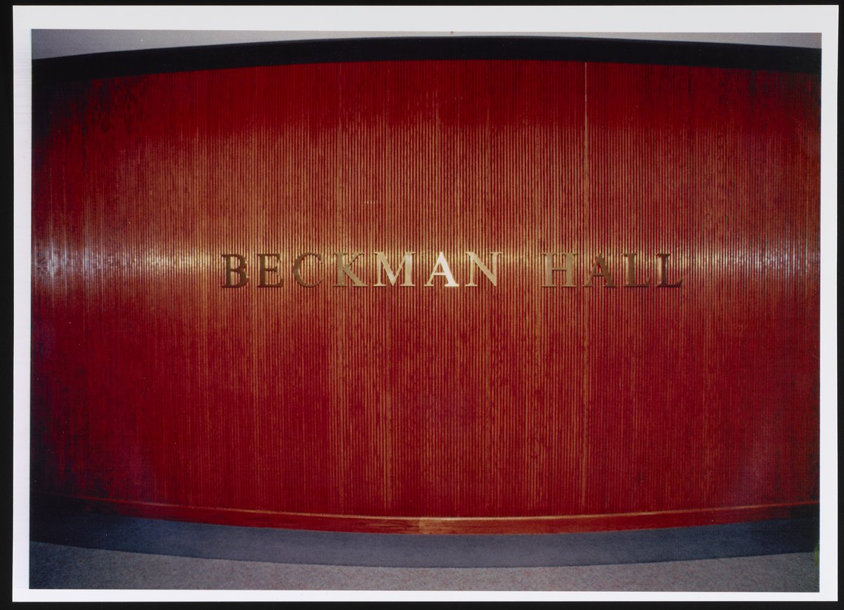 The sign marking Beckman Hall, part of an underground facility on the campus of Harvey Mudd College in Claremont, California. The hall was dedicated in the early 1990s.