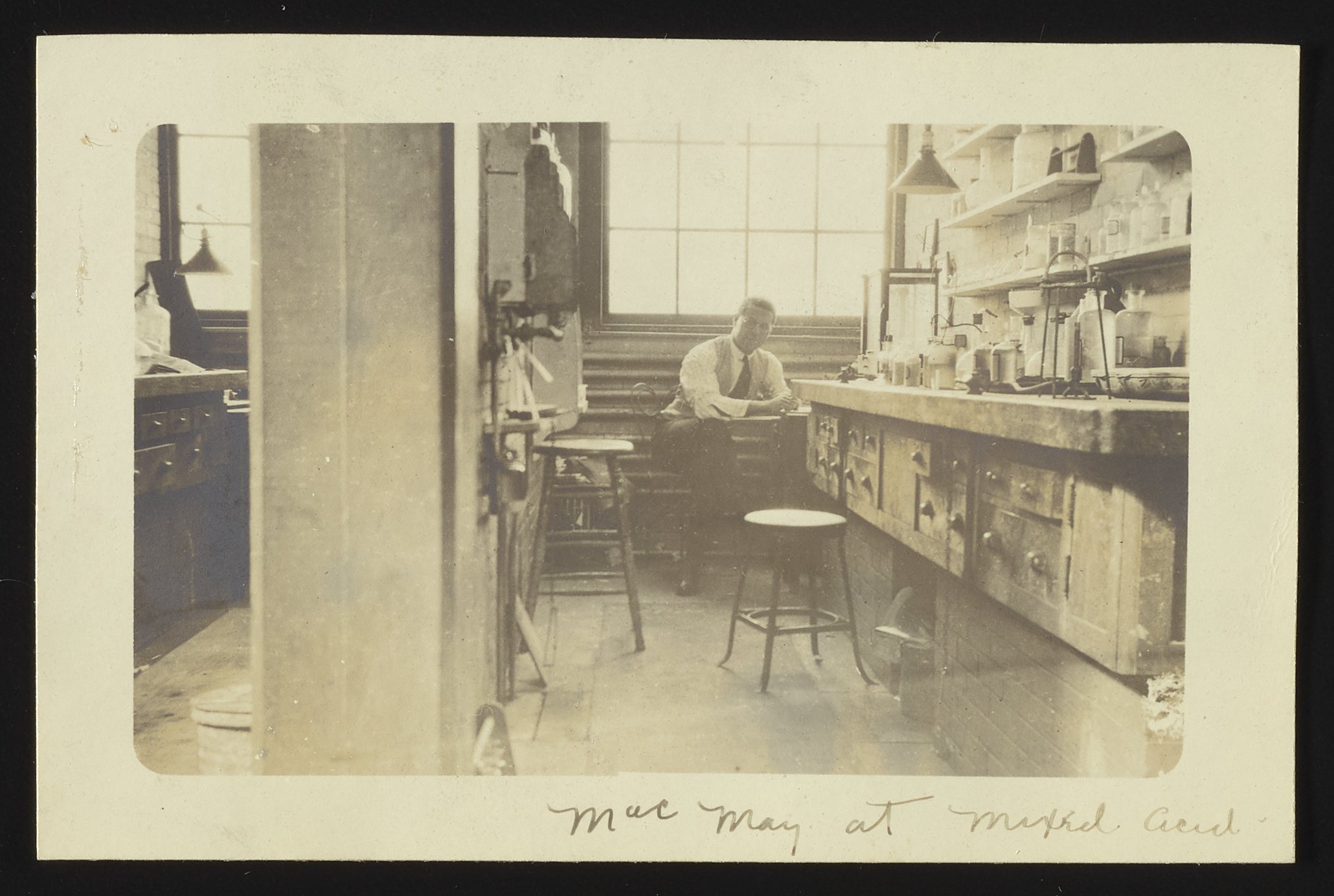 Laboratory assistant at mixed acid work bench