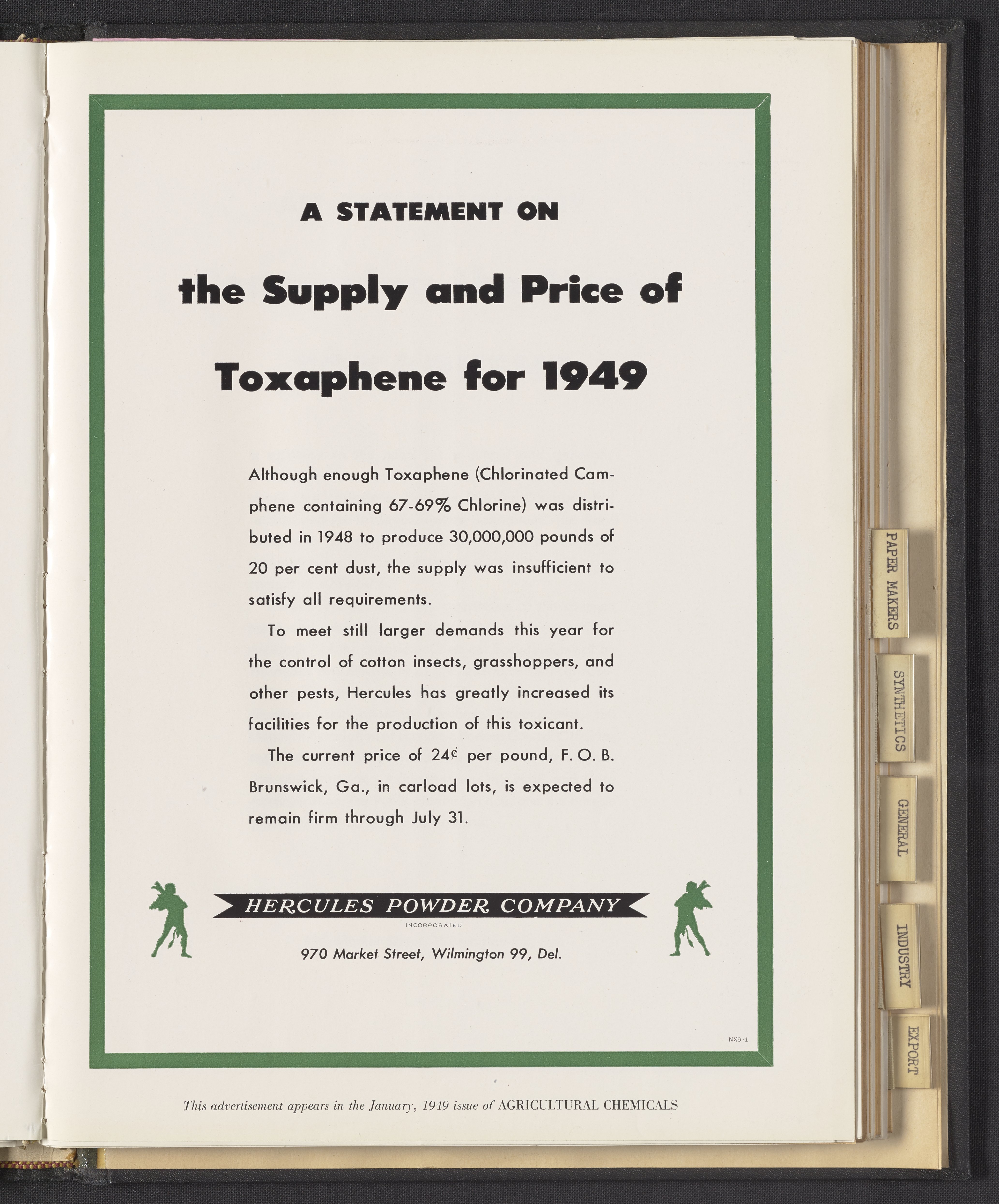 Hercules Incorporated. “A Statement on the Supply and Price of Toxaphene for 1949.” 1949 Hercules Advertisements, 1949. Records of Hercules Incorporated, Volume 1949. Science History Institute. Philadelphia. https://digital.sciencehistory.org/works/8c97kr27t.