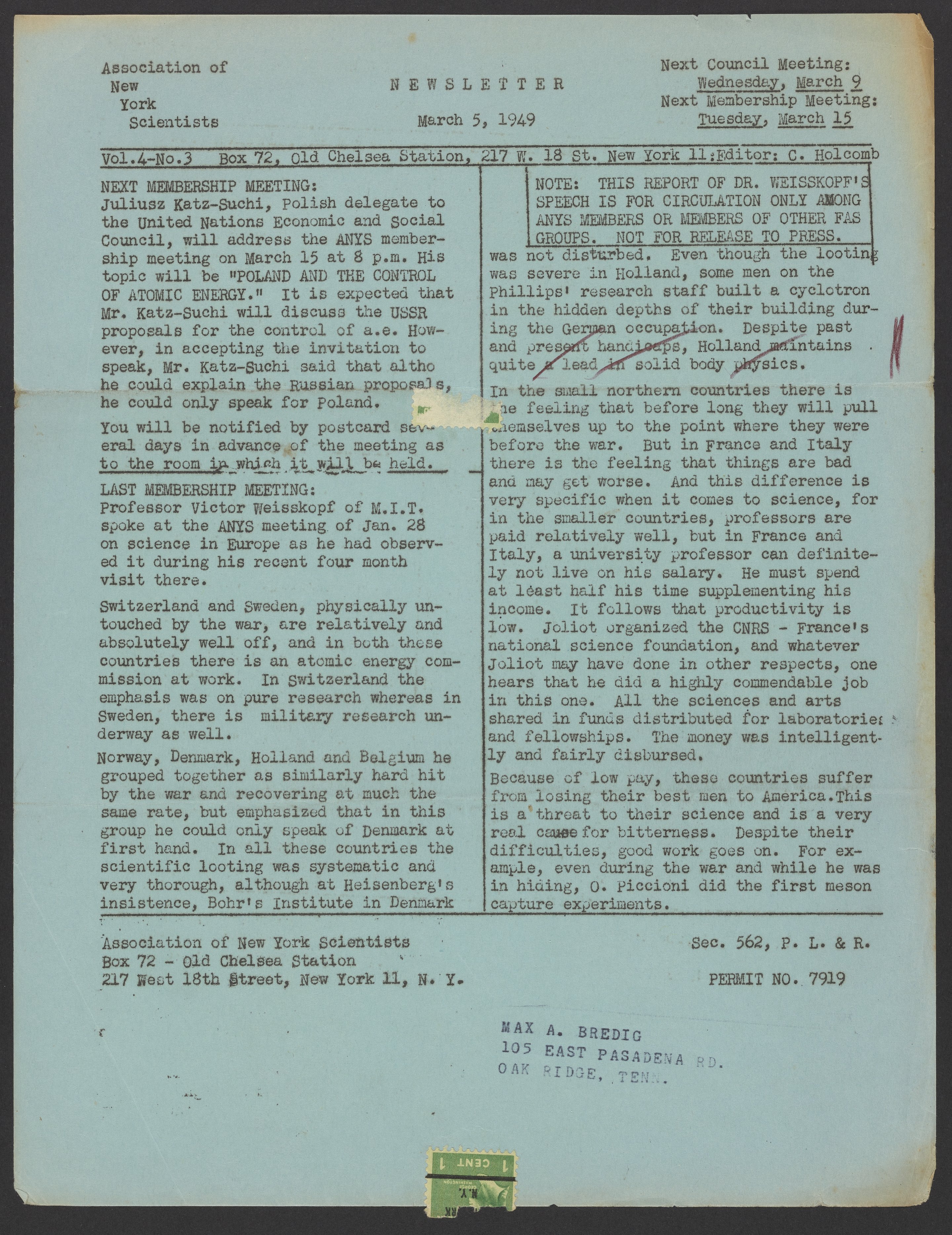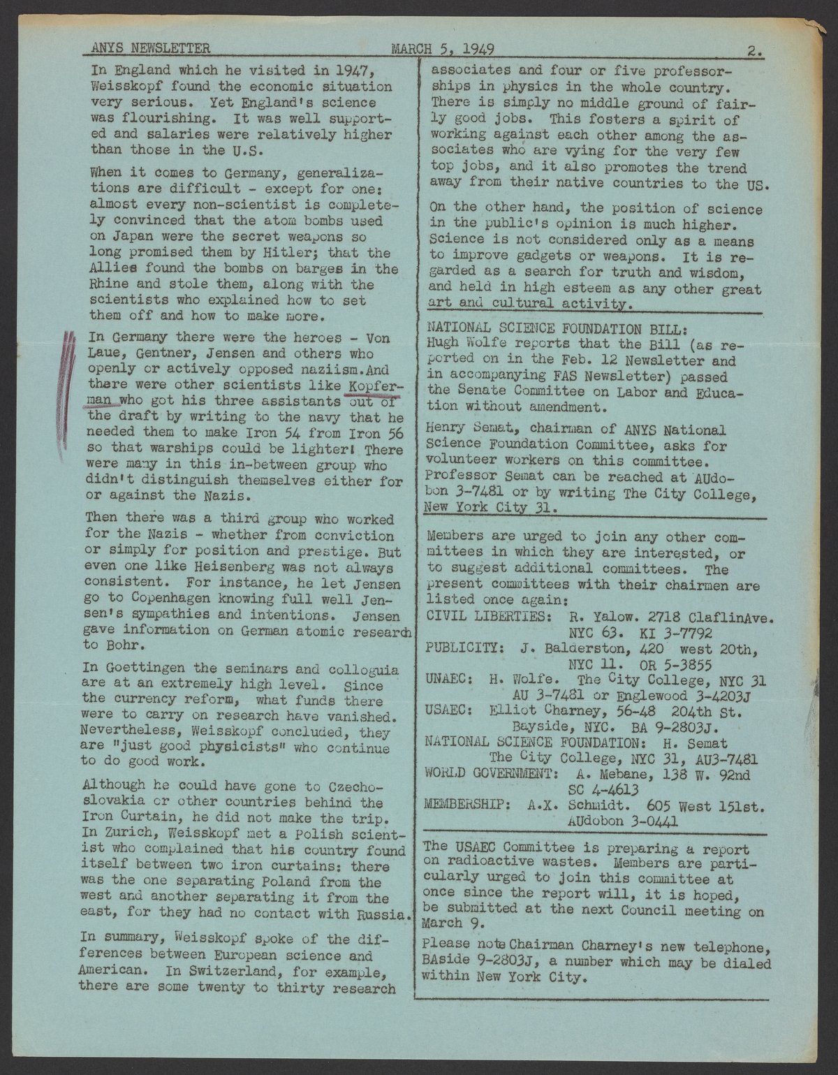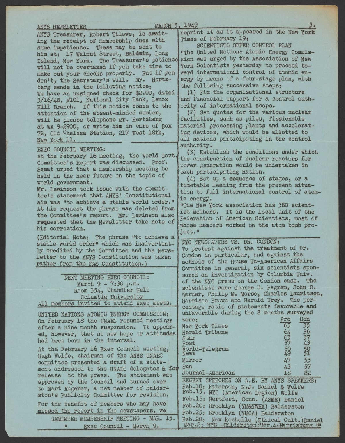 Association of New York Scientists Newsletter, March 5, 1949