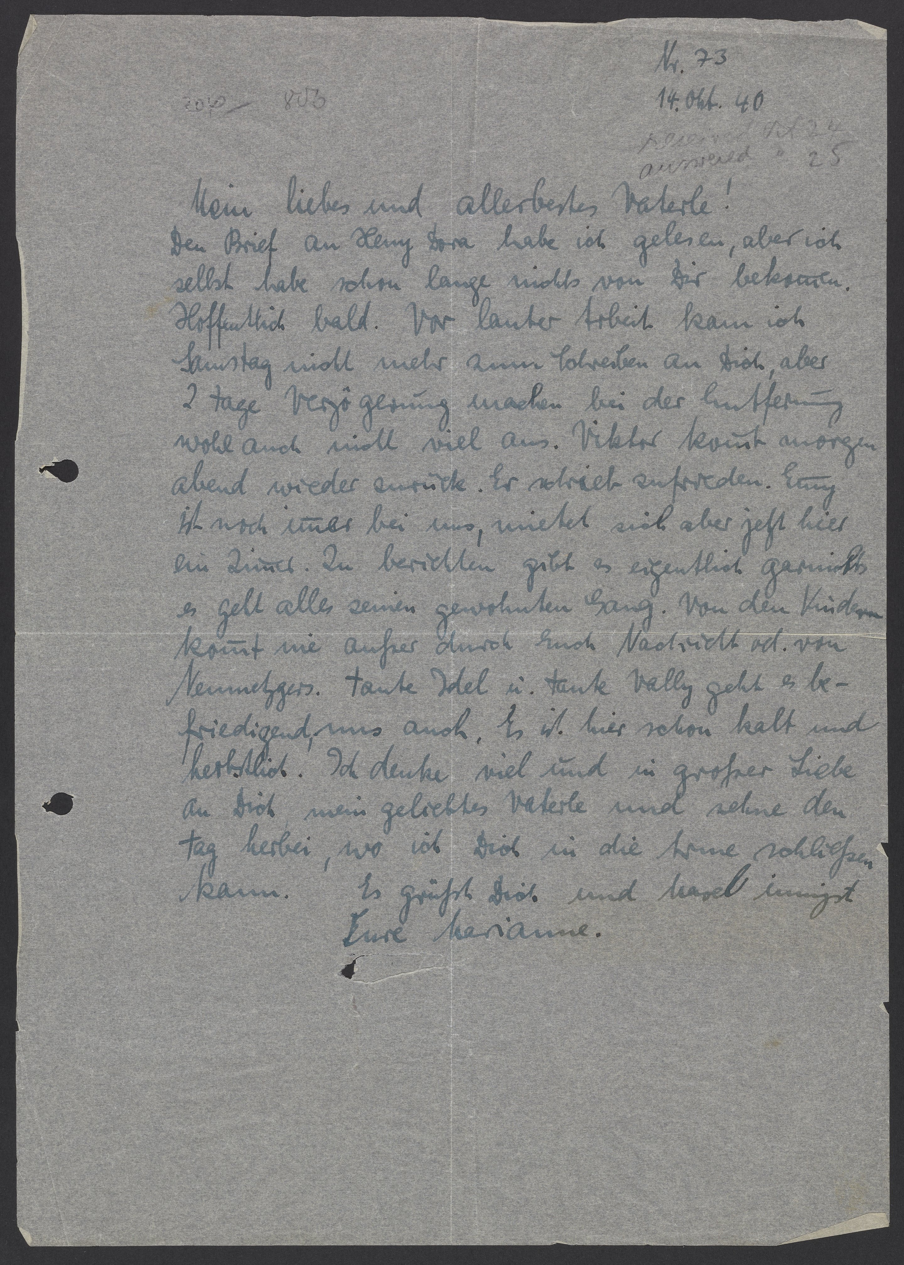 I didn’t read the letter to Henry Dora, but I haven’t received anything from you in a long time. Hopefully soon. I can no longer write to you on Saturday because of all the work, but a two day delay probably doesn't make much difference when it comes to distance. Viktor will return tomorrow evening. He wrote and was content. E---y is still with us, but is renting a room here now. There isn't really anything new to report. Everything is the same as usual. There is never any news about the children except from you or the Neumetzgers. Aunt Idel and Aunt Valley are doing well and we are too. It's already cold and autumn-like here. I think of you a lot and with great love, my beloved Papa, and long for the day when I can hug you. Best wishes to you and Max.