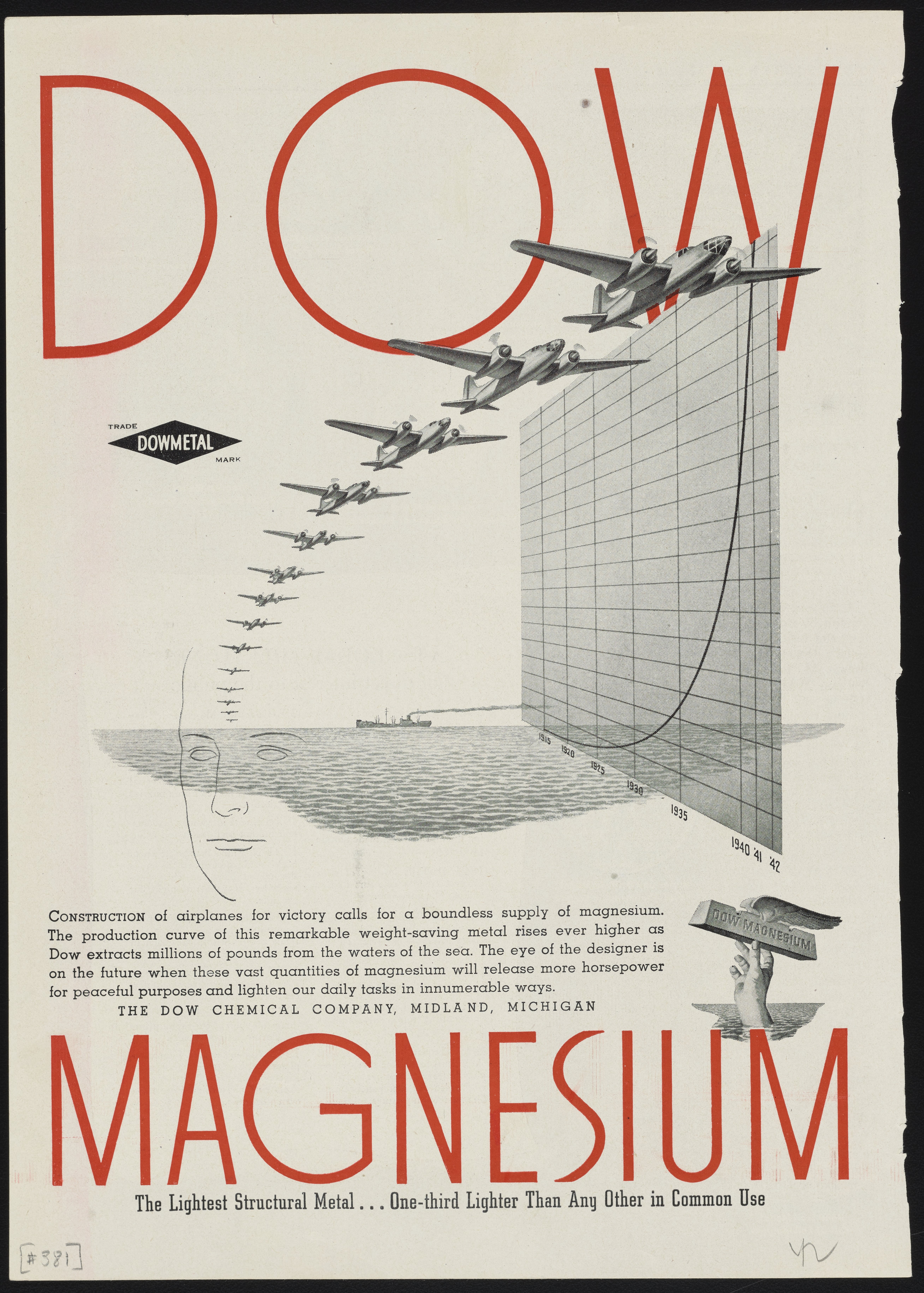 Dow Chemical Company. “Advertisement for Dowmetal Magnesium,” circa 1942. Advertisements from the Dow Chemical Historical Collection, Box 8. Science History Institute. Philadelphia. https://digital.sciencehistory.org/works/8dh4fnh.