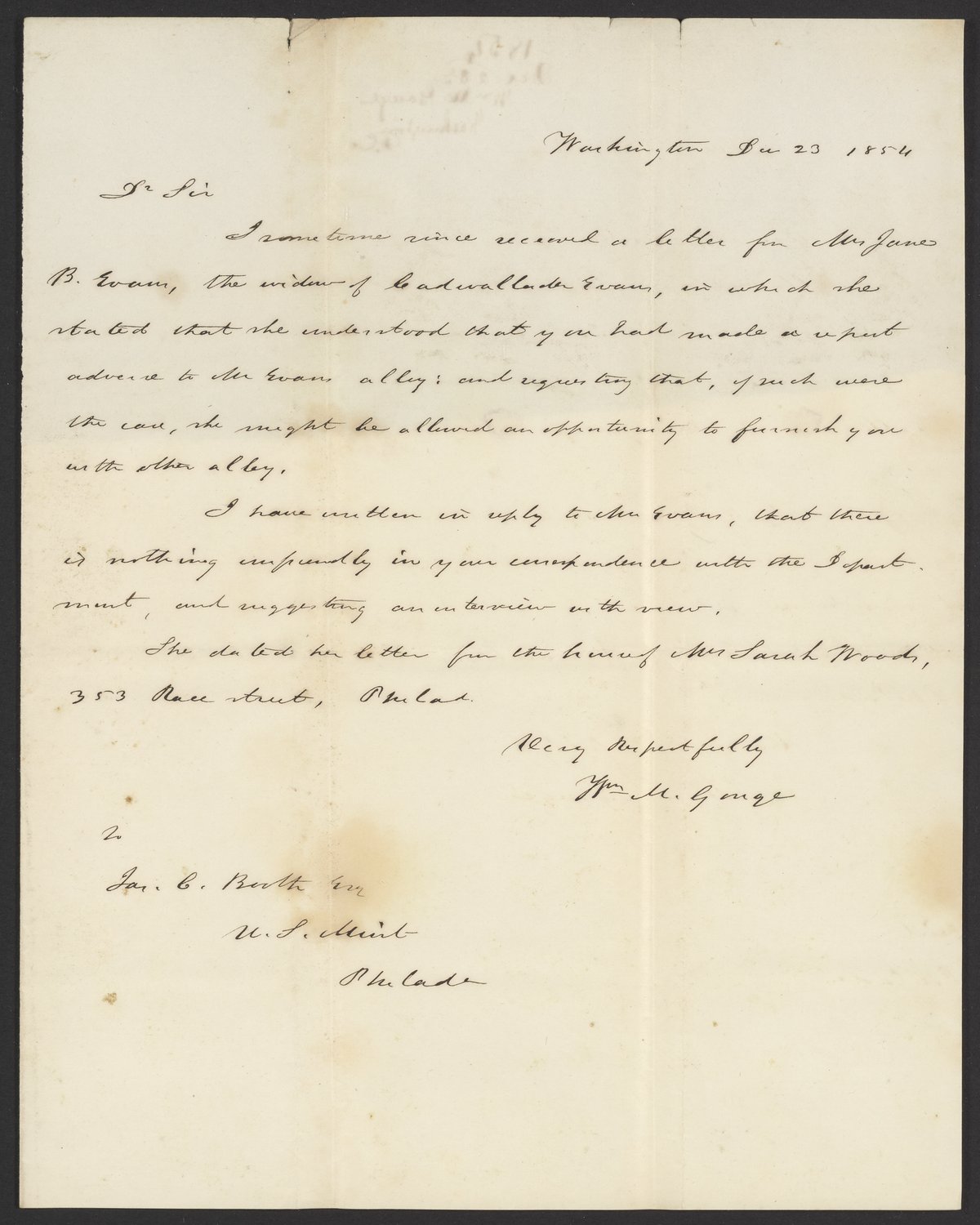 “Letter from W.M. Gouge to James Curtis Booth, December 23, 1854,” December 23, 1854. Papers of James Curtis Booth, Box 1, Folder 6. Science History Institute. Philadelphia. https://digital.sciencehistory.org/works/8ffeity.
