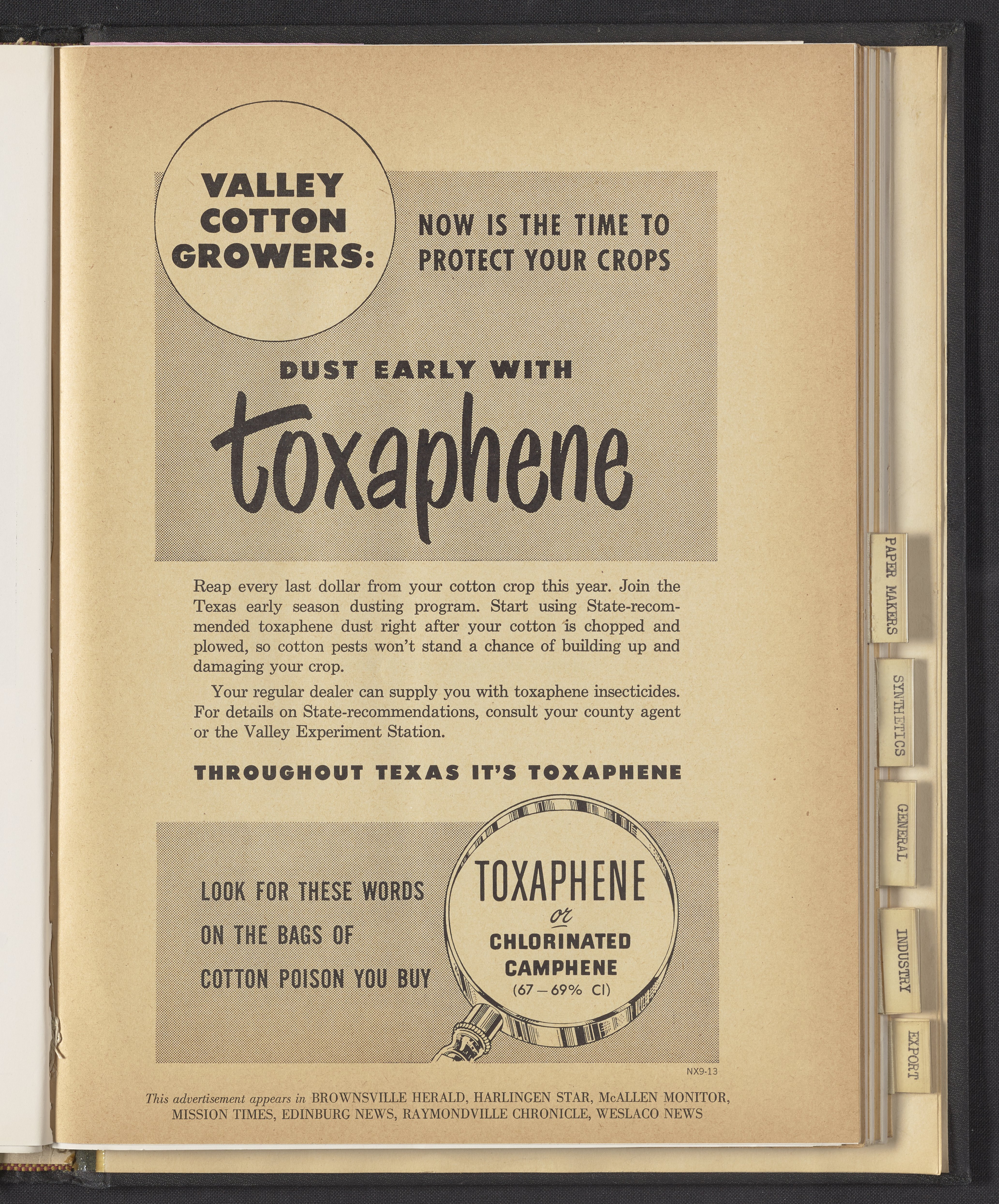 Hercules Incorporated. “Valley Cotton Growers: Now Is the Time to Protect Your Crops.” 1949 Hercules Advertisements, 1949. Records of Hercules Incorporated, Volume 1949. Science History Institute. Philadelphia. https://digital.sciencehistory.org/works/8g84mn00n.