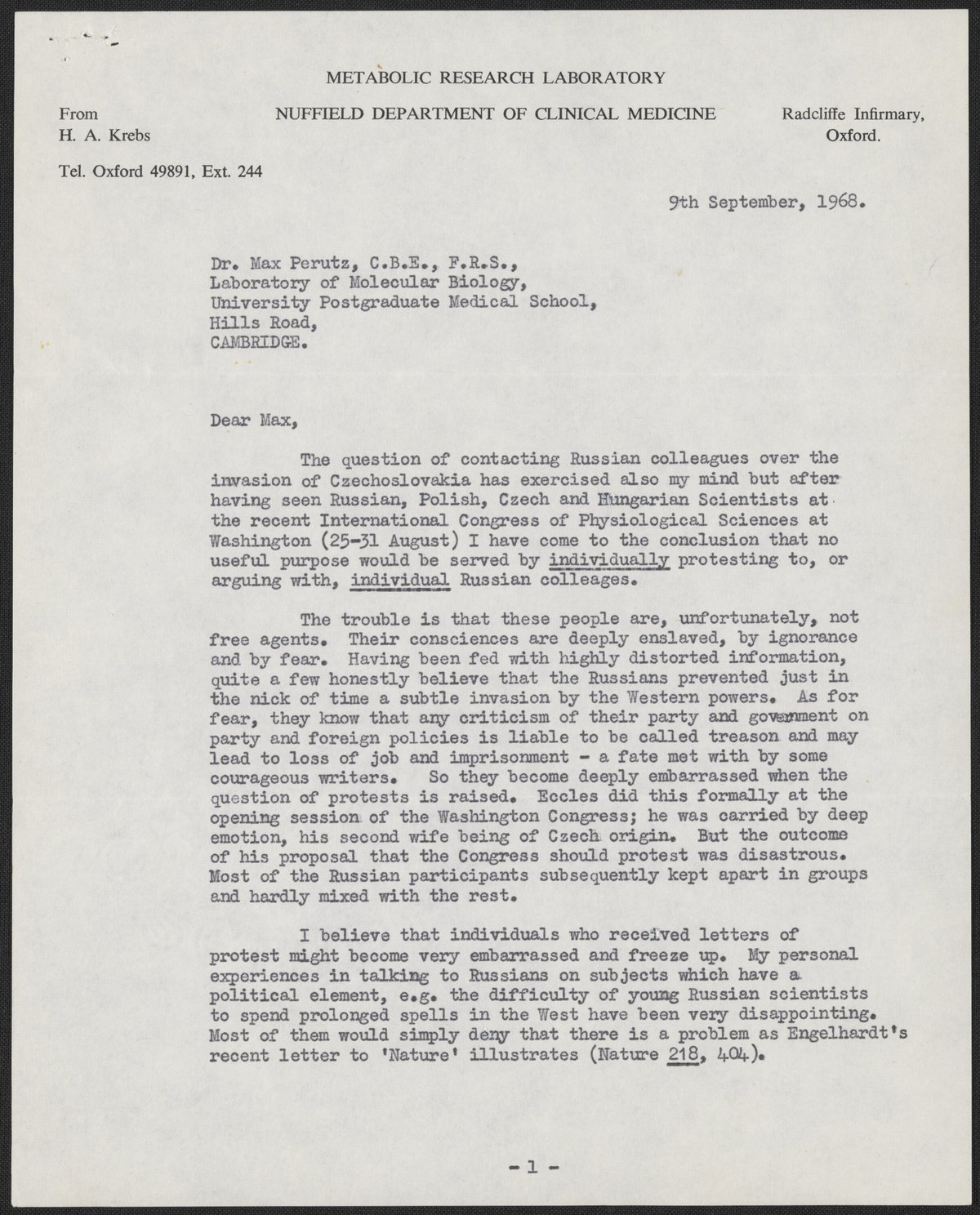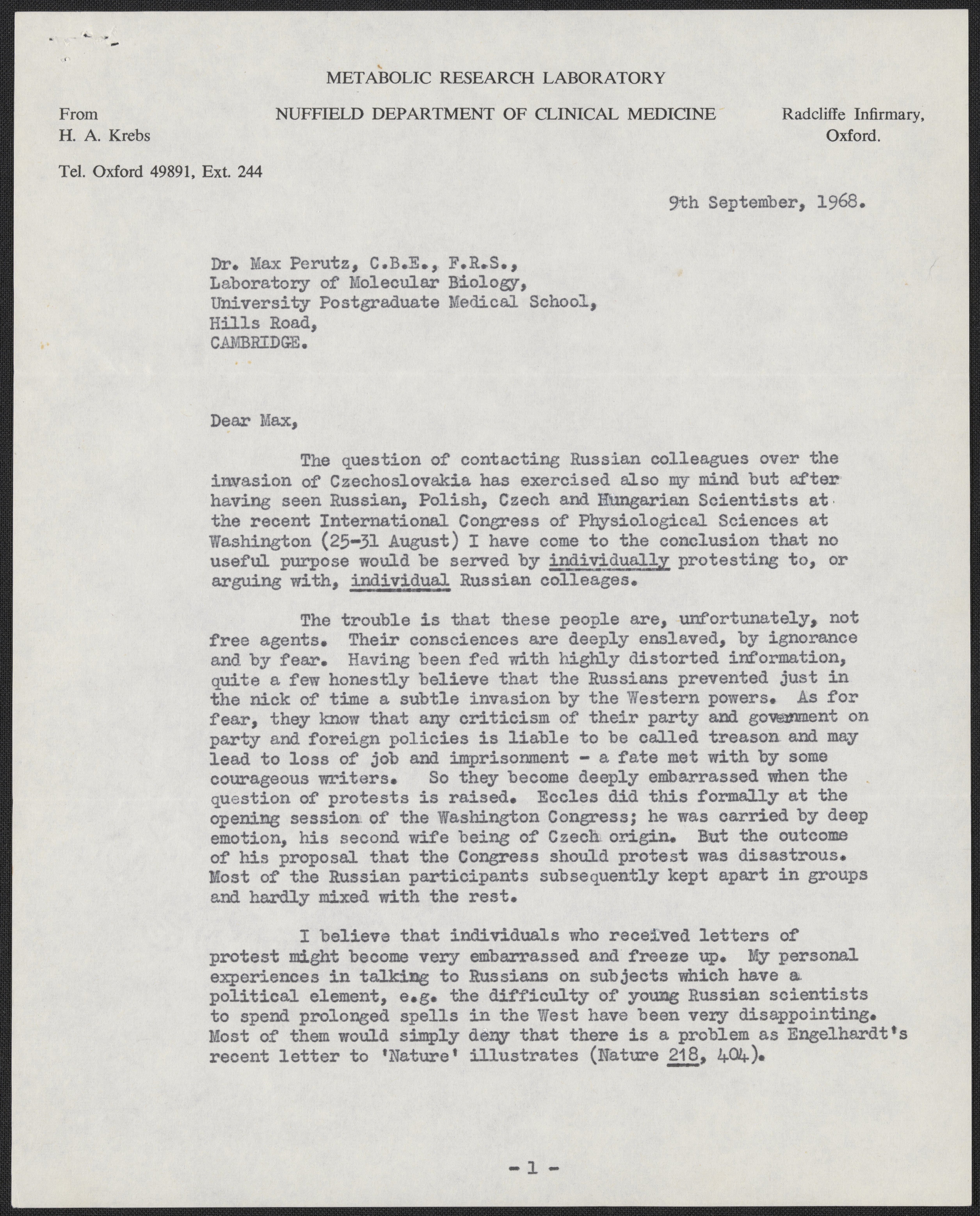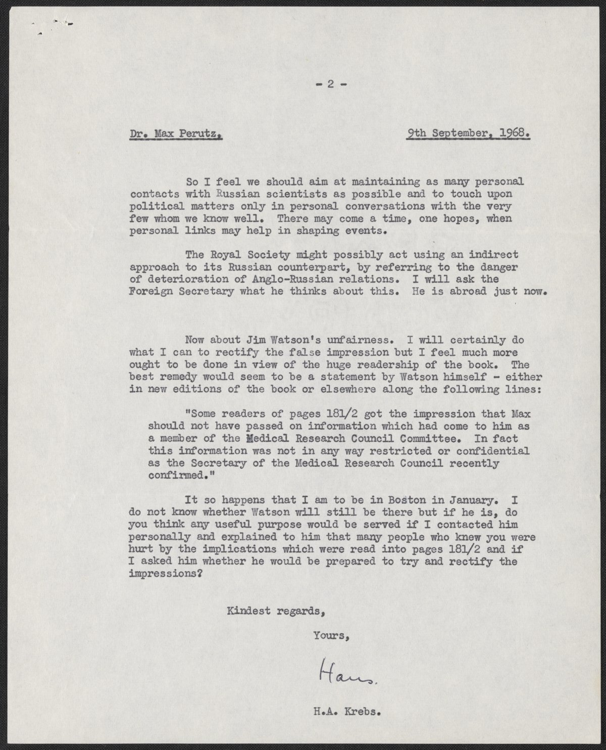 Letter from Hans A. Krebs to Max Perutz, September 9, 1968