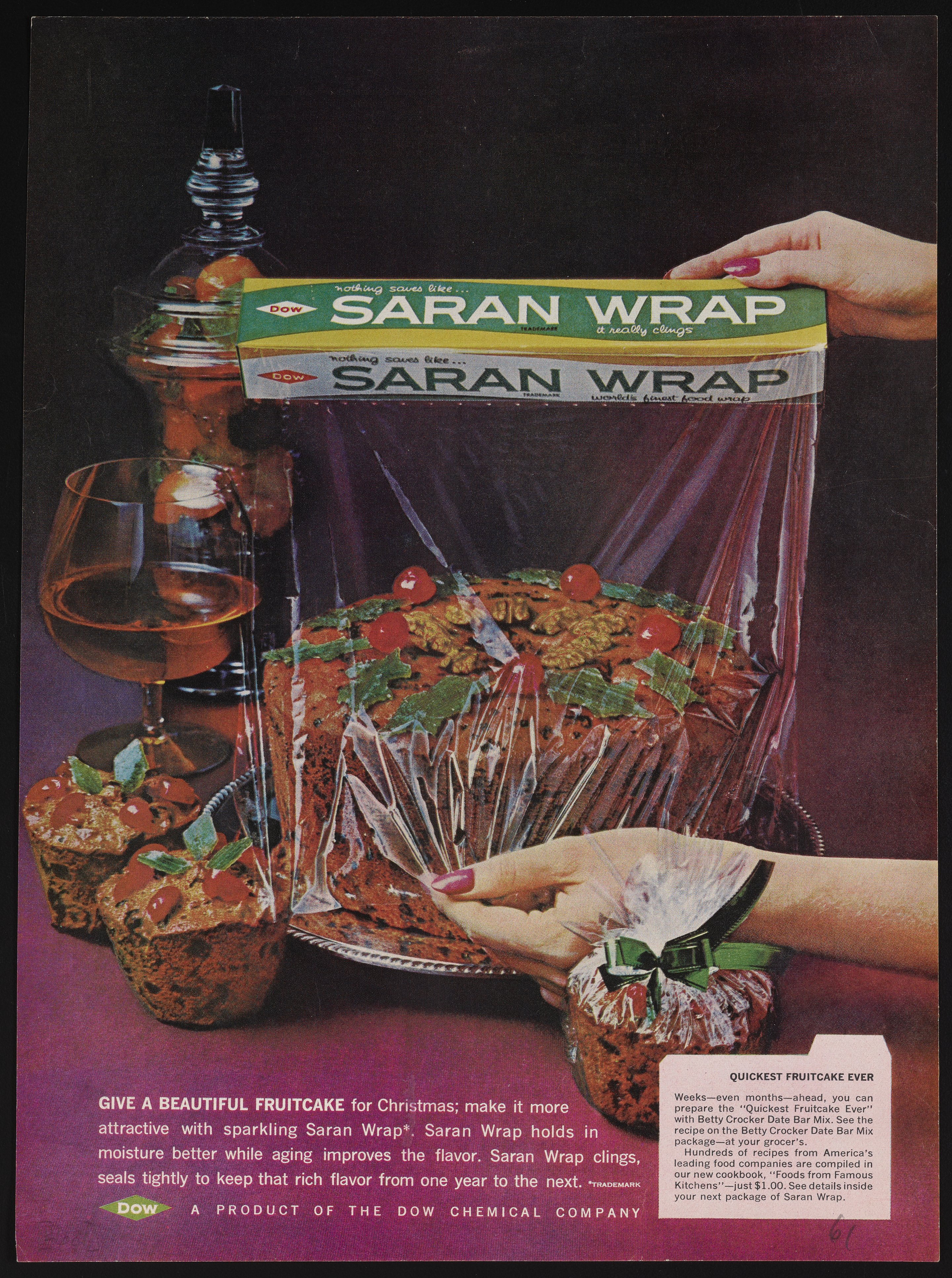 Color print advertisement for Saran Wrap, a product of the Dow Chemical Company. The advertisement features a photograph of a fruitcake being covered in Saran Wrap by a pair of manicured hands. The package of Saran Wrap is displayed prominently. The accompanying text describes the benefits of using Saran for food packaging. Smaller text includes a promotion for the "Food from Famous Kitchens" cookbook.