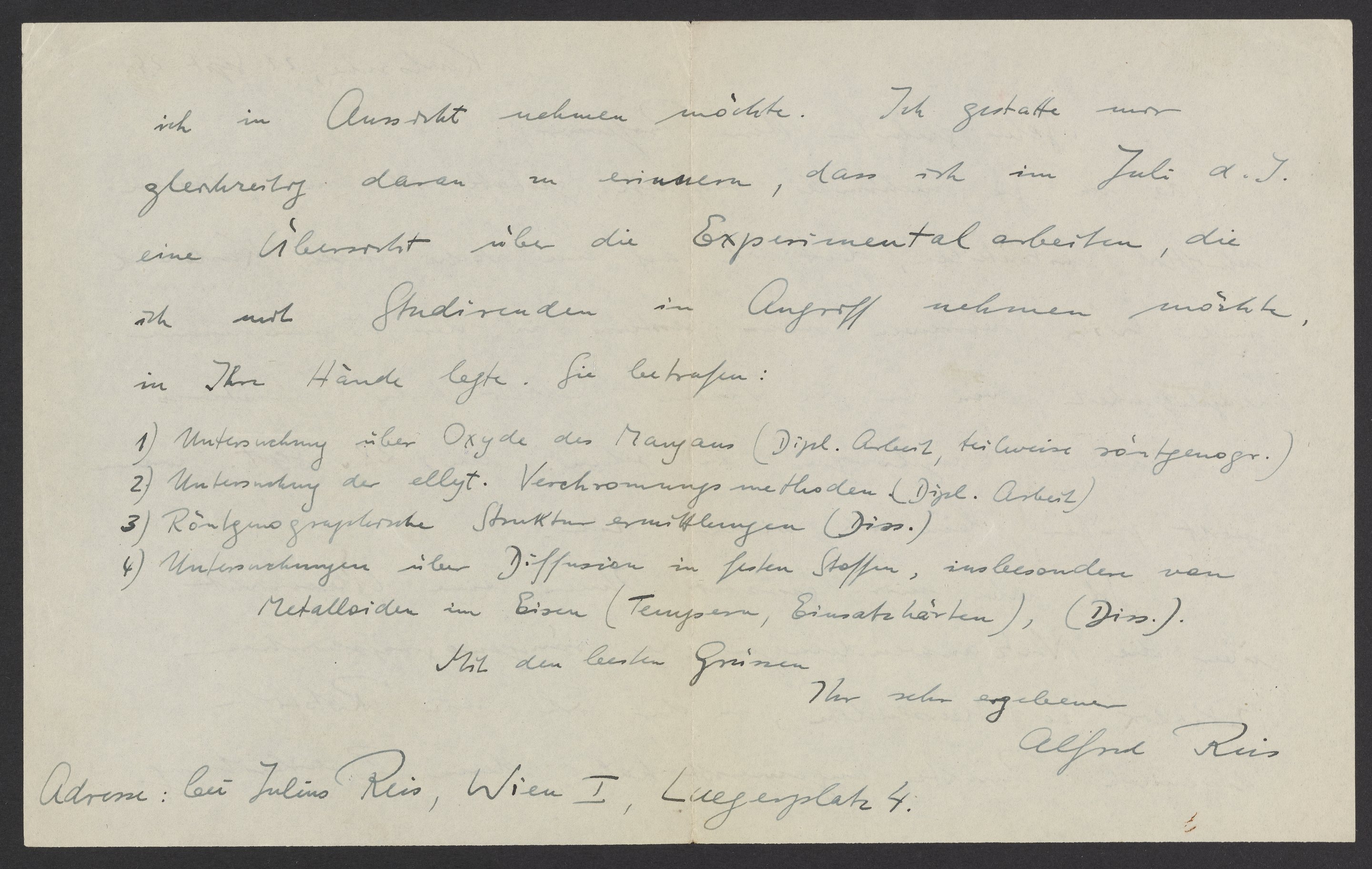 Small JPG1200 x 755px — 118 KBLarge JPG2880 x 1811px — 725 KBFull-sized JPG5470 x 3440px — 2.7 MBOriginal fileTIFF — 5470 x 3440px — 53.9 MBAlfred Reis (1882-1951), an Austrian physicist, informs his colleague, Georg Bredig (1868-1944), that he sent him an overview of useful methods for X-ray technology. Reis additionally mentions scientific projects he would like to undertake with students in Karlsruhe.