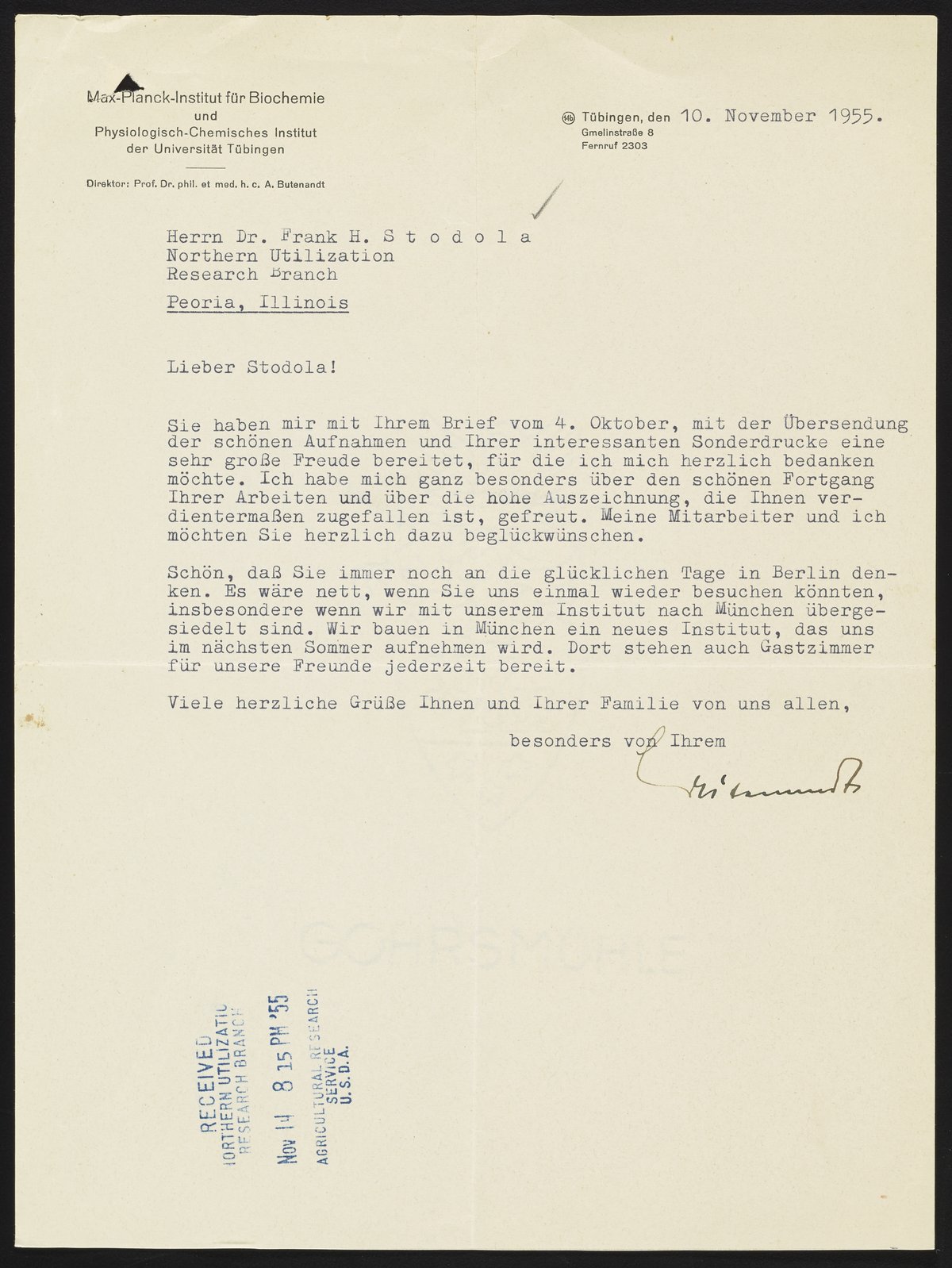 Butenandt, Adolf. “Letter from Adolf Butenandt to Frank Stodola,” November 10, 1955. Frank H. Stodola Nobel Laureate Letter Collection, Box 1. Science History Institute. Philadelphia. https://digital.sciencehistory.org/works/8k71nh116.