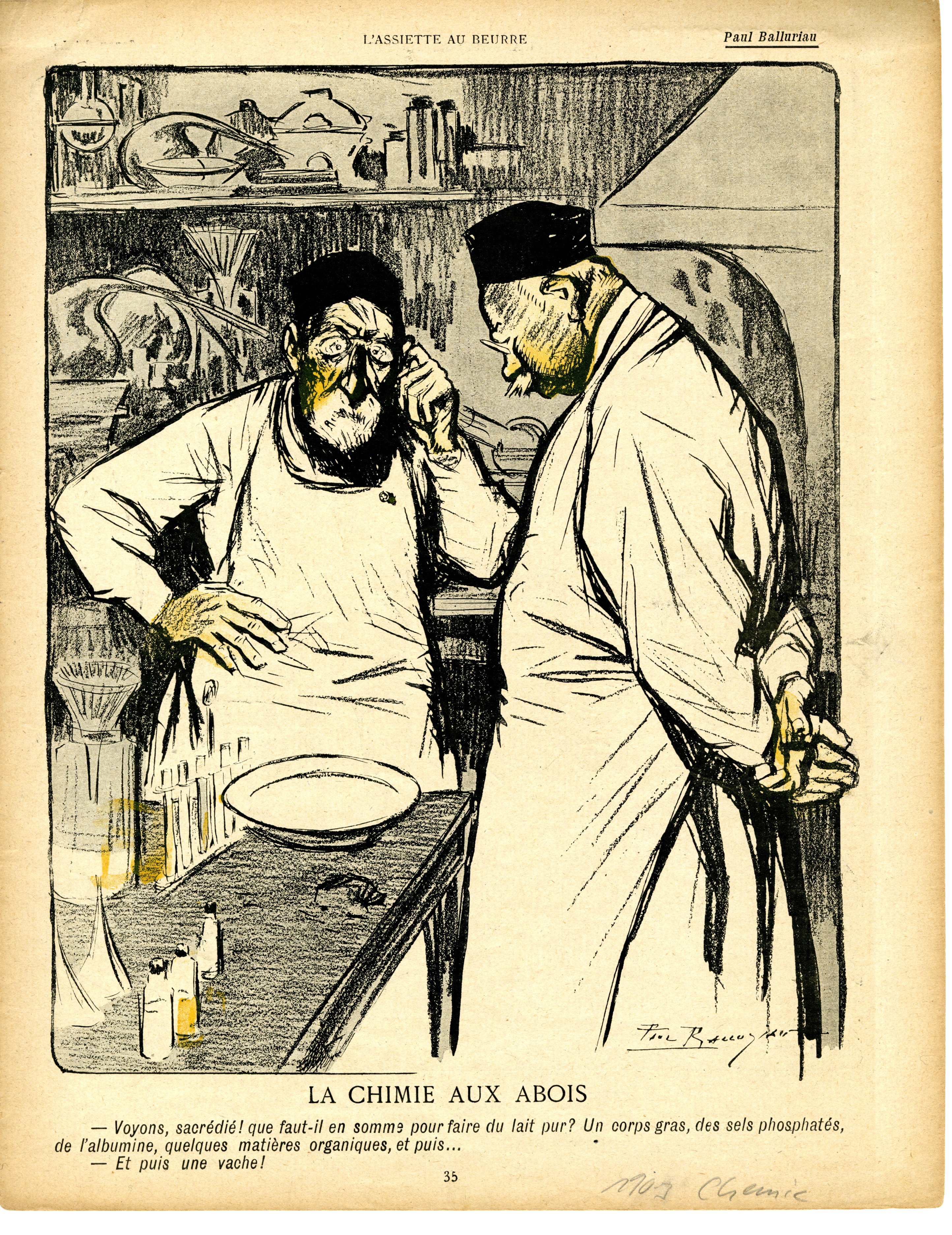 Full-page offset lithograph print in two colors (black and yellow/orange). "La Chimie aux Abois" appeared as a full-page illustration in the French satirical magazine L'Assiette au beurre (The Trough) in 1903. The print's title translates to "Chemistry at Bay," and shows two chemists standing in puzzled contemplation over a dish of milk. Beneath the title, a caption reads, "Voyons, sacredie! Que faut-il en somme pour faire du lait pur? Un corps gras, des seis phosphates, de l'albumine, quelques matieres organiques, et puis... Et puis une vache!" (Translation: "Come on, by God! What does it take to make pure milk? Some fats, some phosphates, albumin, some organic materials, and then... And then a cow!")