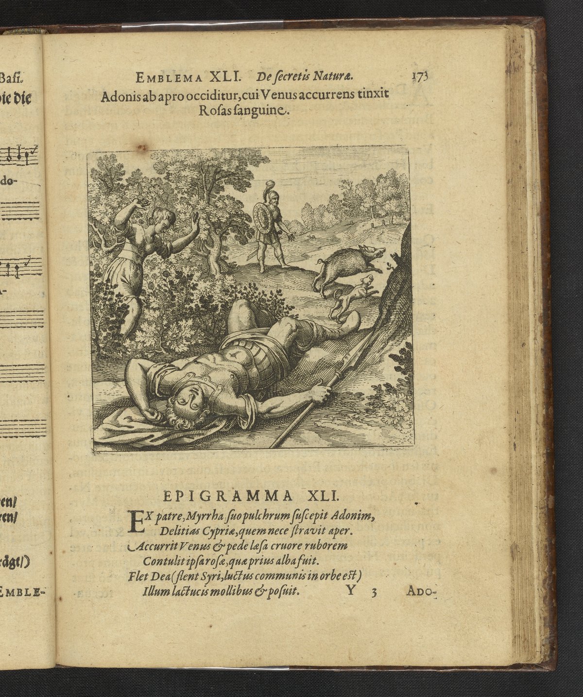 • Emblem 41. Adonis is slain by a boar, and as Venus comes running she colors the Roses with her blood.