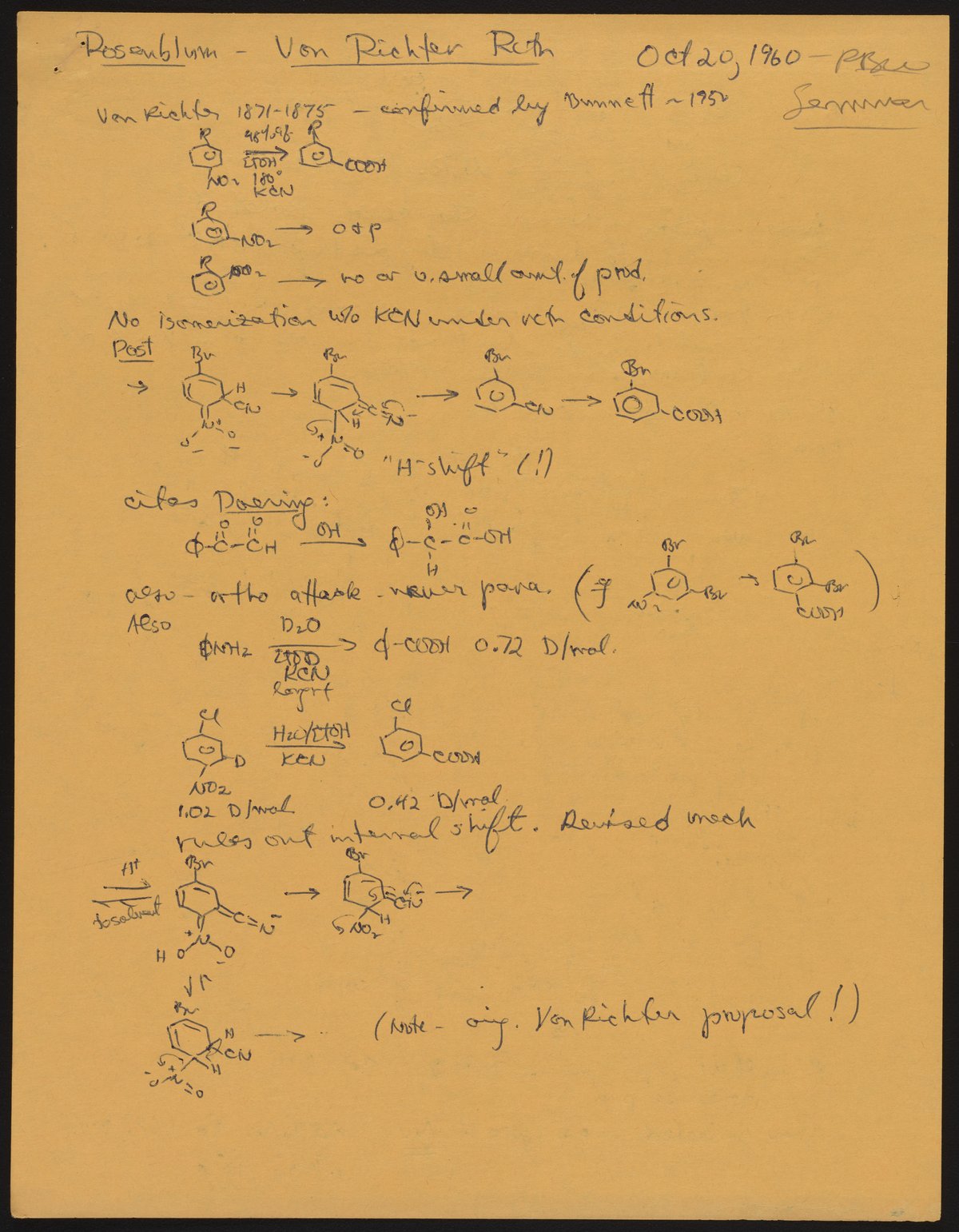 Kohler, Robert E. “R. B. (Robert Burns) Woodward Seminar Entitled ‘Rosenblum - Von Richter [Reaction]".” Notes from R. B. (Robert Burns) Woodward's Seminars, circa 1959–1966. Folder 2. Science History Institute. Philadelphia. https://digital.sciencehistory.org/works/8k71nj325.