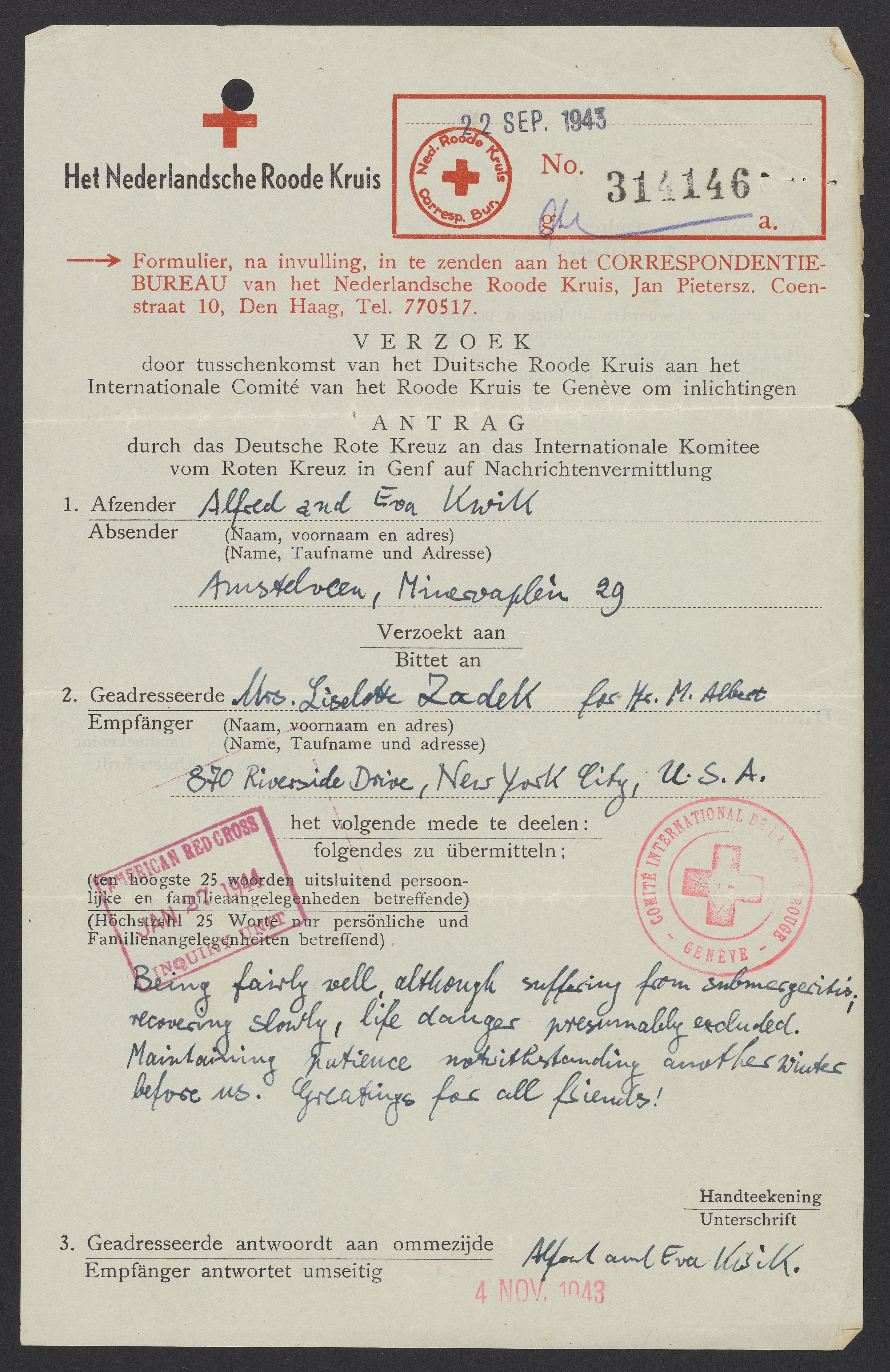 In this letter, the Schnells tell Zadek that they are ill with “submergeritis” but on the road to recovery. “Submergeritis” may be a code word for their dread of being in hiding through another winter. The Schells' mentions of health and recovery in their letters may be a cipher for conveying their safety or status in hiding. While the message is dated September 22, 1943, it was not received until January 27, 1944.