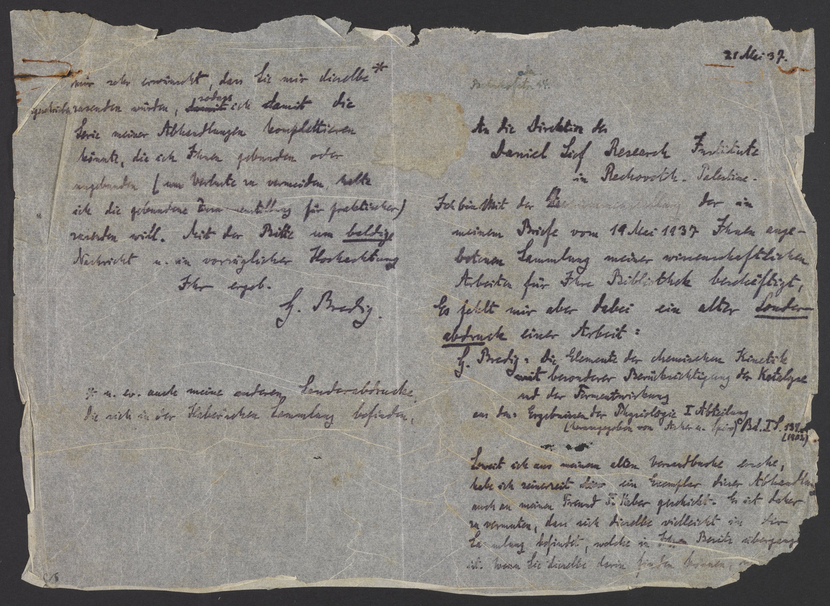 Letter from Georg Bredig to the Daniel Sieff Research Institute