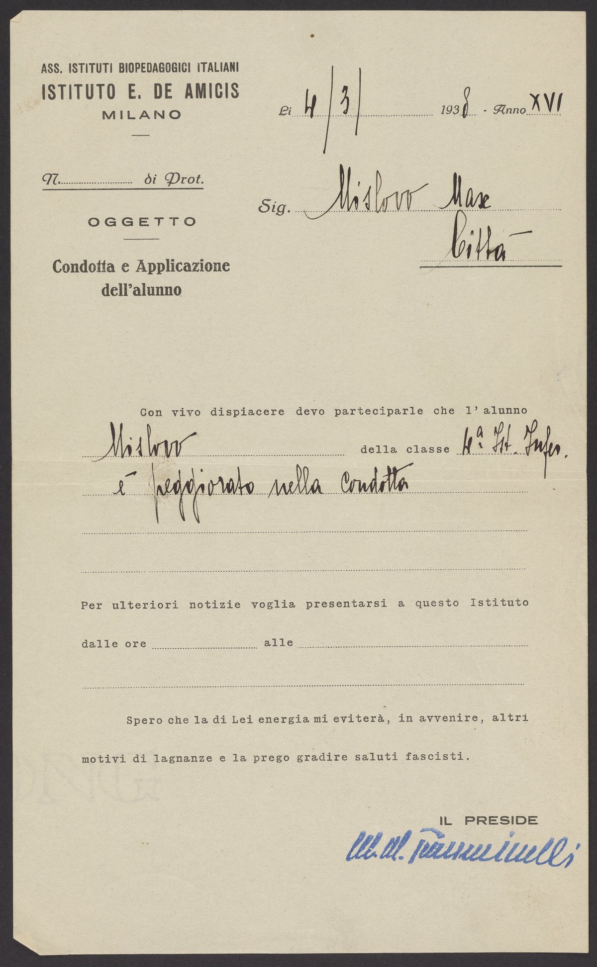 Kurt M. Mislow's student conduct report, Istituto Edmondo De Amicis, March 4, 1938