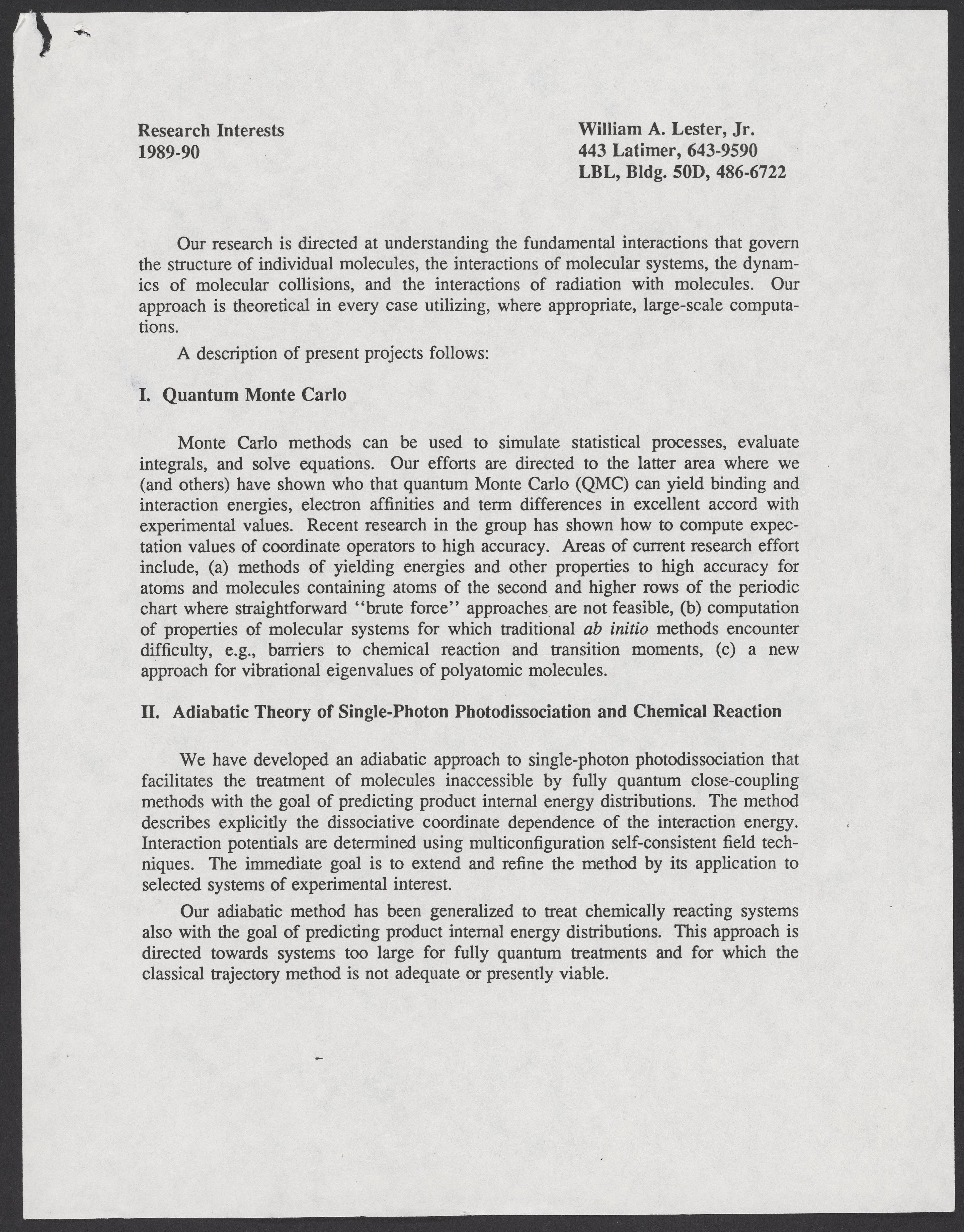 Lester, William A., Jr. “Research Interests of William A. Lester, Jr.,” 1989–1991. William A. Lester, Jr. Papers, Box 33, Folder 22. Science History Institute. Philadelphia. https://digital.sciencehistory.org/works/8mas3e2.
