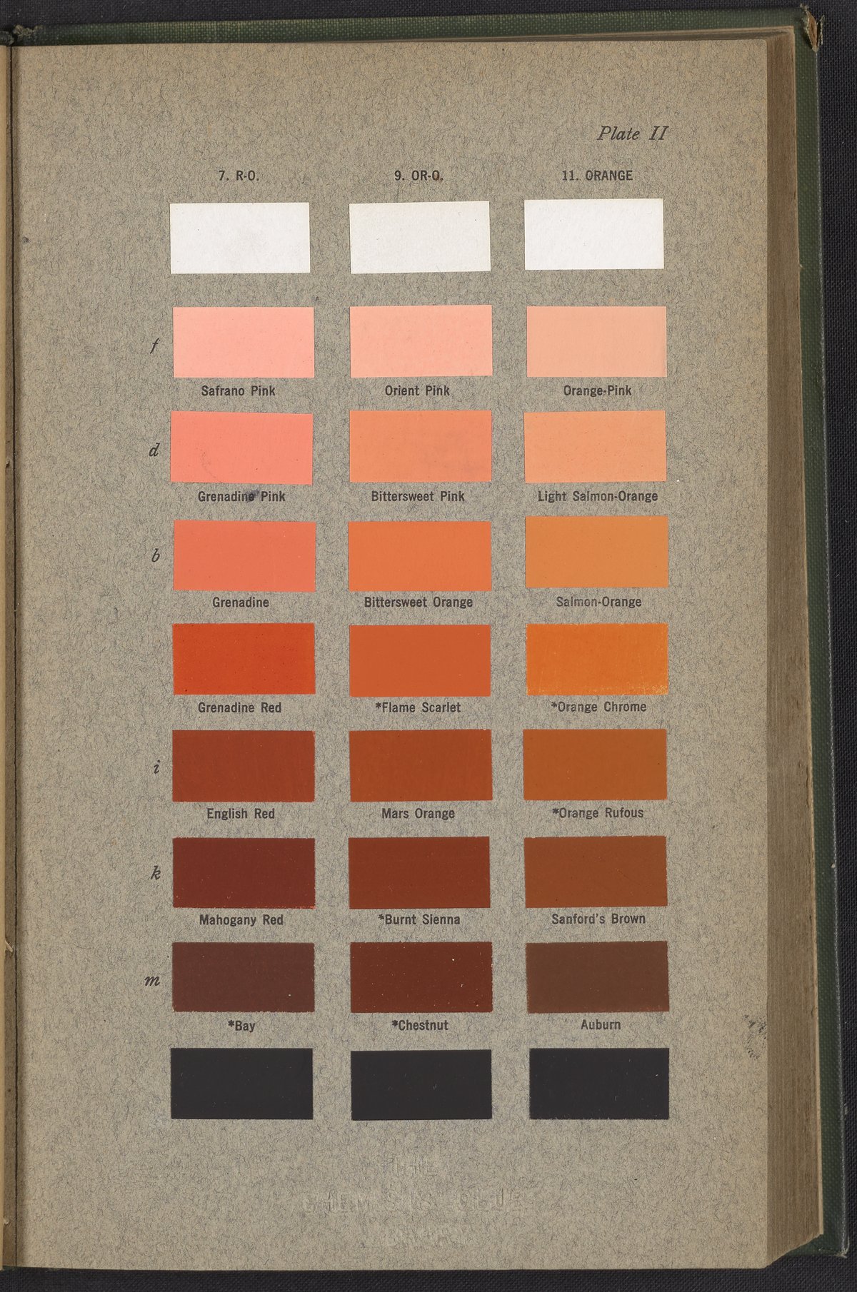 Small JPG1200 x 1746px — 379 KBFull-sized JPG2558 x 3721px — 1.5 MBOriginal fileTIFF — 2558 x 3721px — 27.3 MBVolume written with the intent to apply standardized nomenclature to colors and color names. The work is self-proclaimed as one of the few "modern books on the subject of color" that is not "purely technical... pertaining to the physics of color, the painter's needs, or to some particular art or industry alone..." It is geared towards the naturalist who seeks to classify or illustrate specimens using a standardized understanding of color. The book contains eleven hundred and fifteen color samples, each with a proposed standard name.