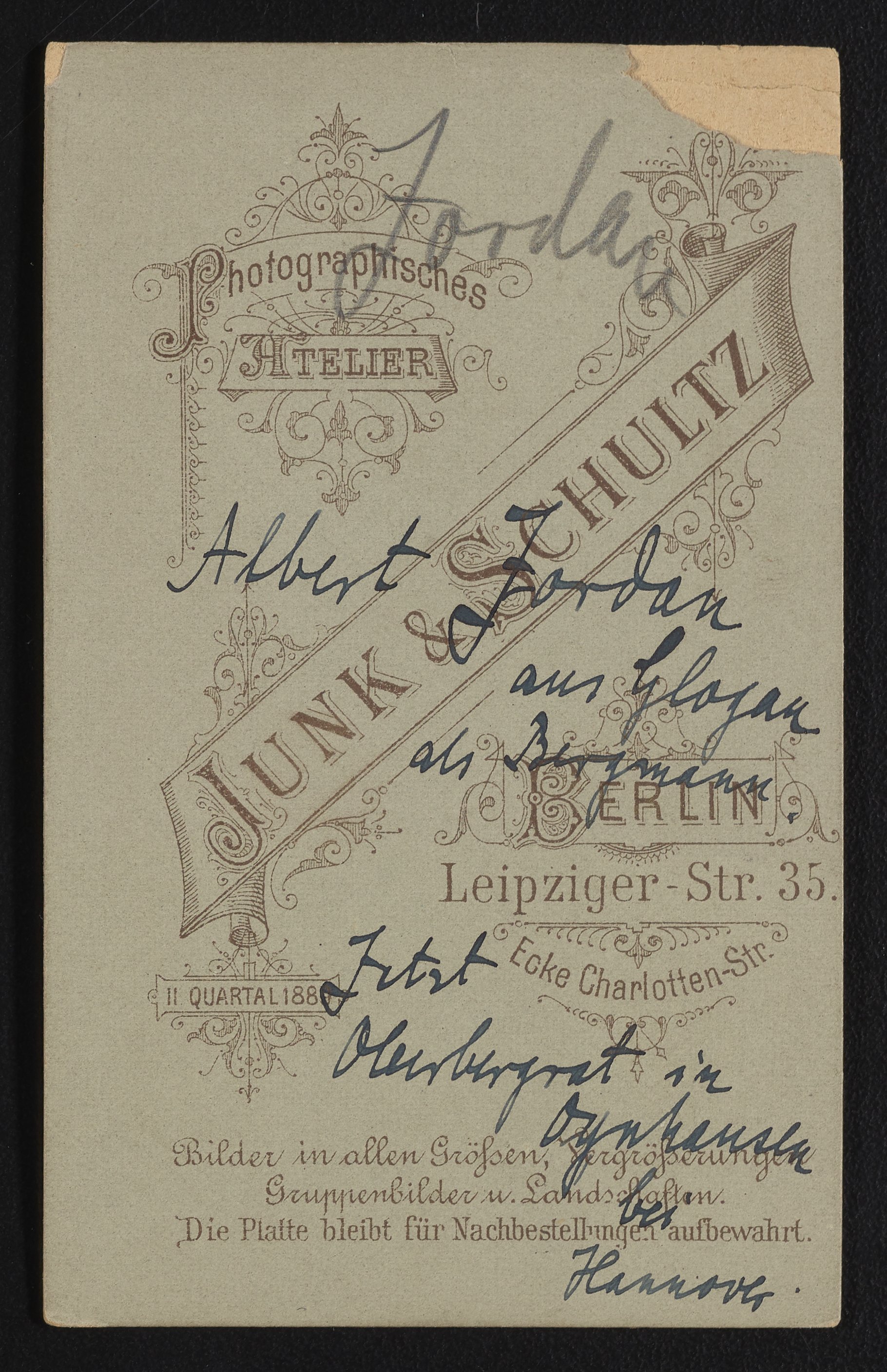 Small JPG1200 x 1863px — 266 KBFull-sized JPG1820 x 2825px — 548 KBOriginal fileTIFF — 1820 x 2825px — 14.8 MBPortrait of Albert Jordan (1865-) dressed as a mountaineer. Jordan was an "oberbergrat" which is a type of government official.