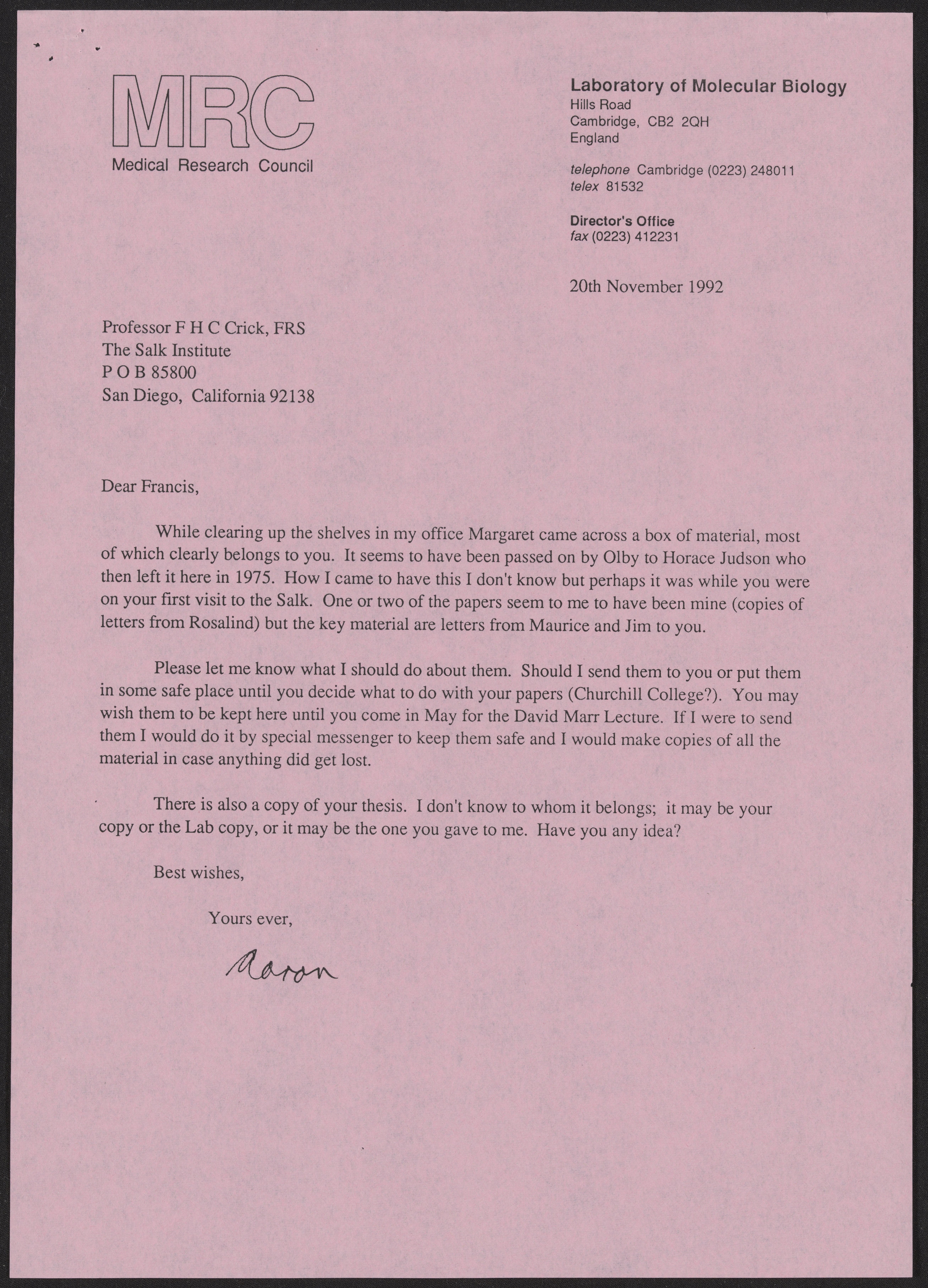 Klug, A. (Aaron), Sir. “Letter from Aaron Klug to Francis Crick, November 20, 1992,” November 20, 1992. History of Molecular Biology Collection, Box 20, Folder 5. Science History Institute. Philadelphia. https://digital.sciencehistory.org/works/8nitlw3.
