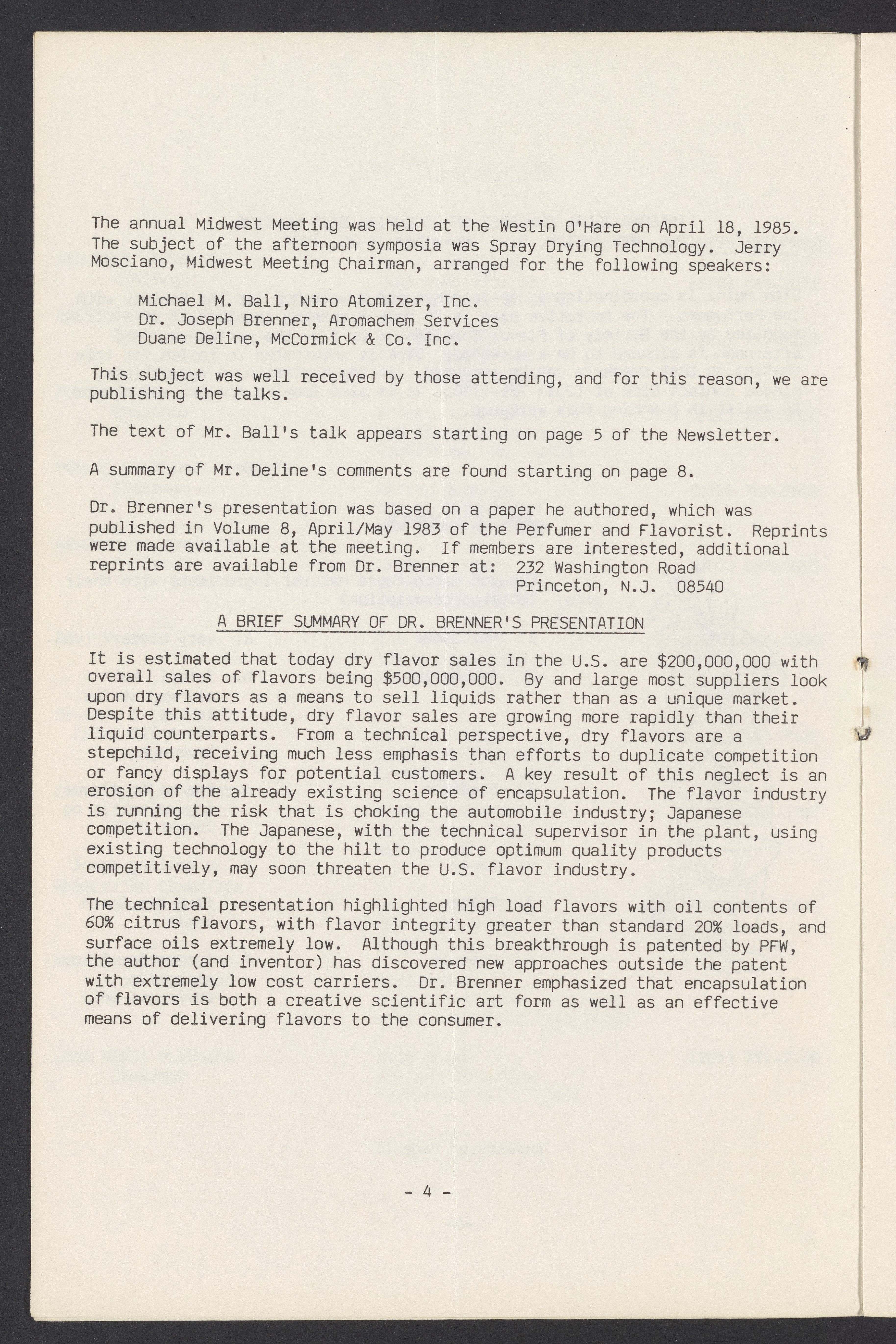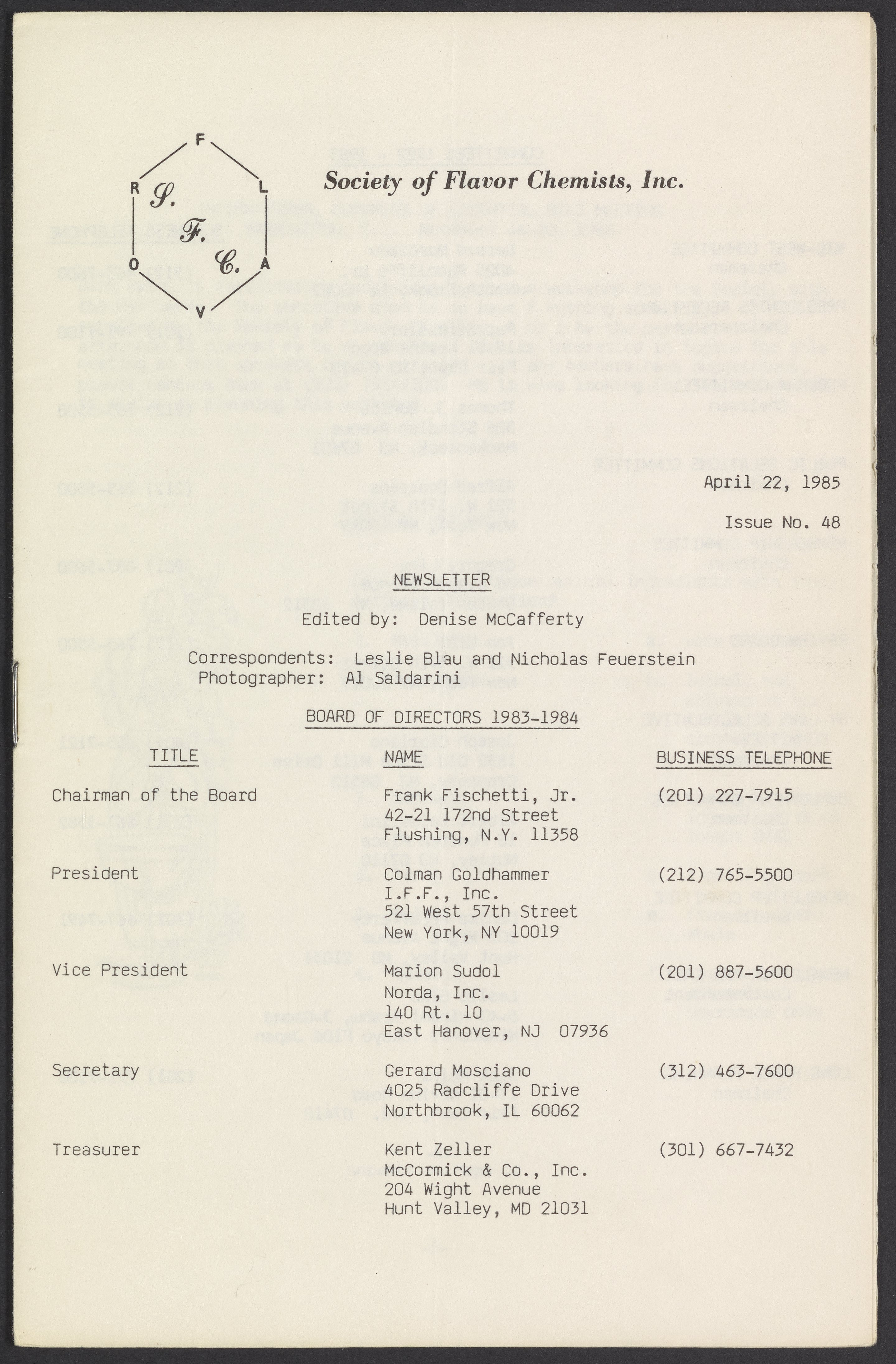 Society of Flavor Chemists newsletter, April 1985