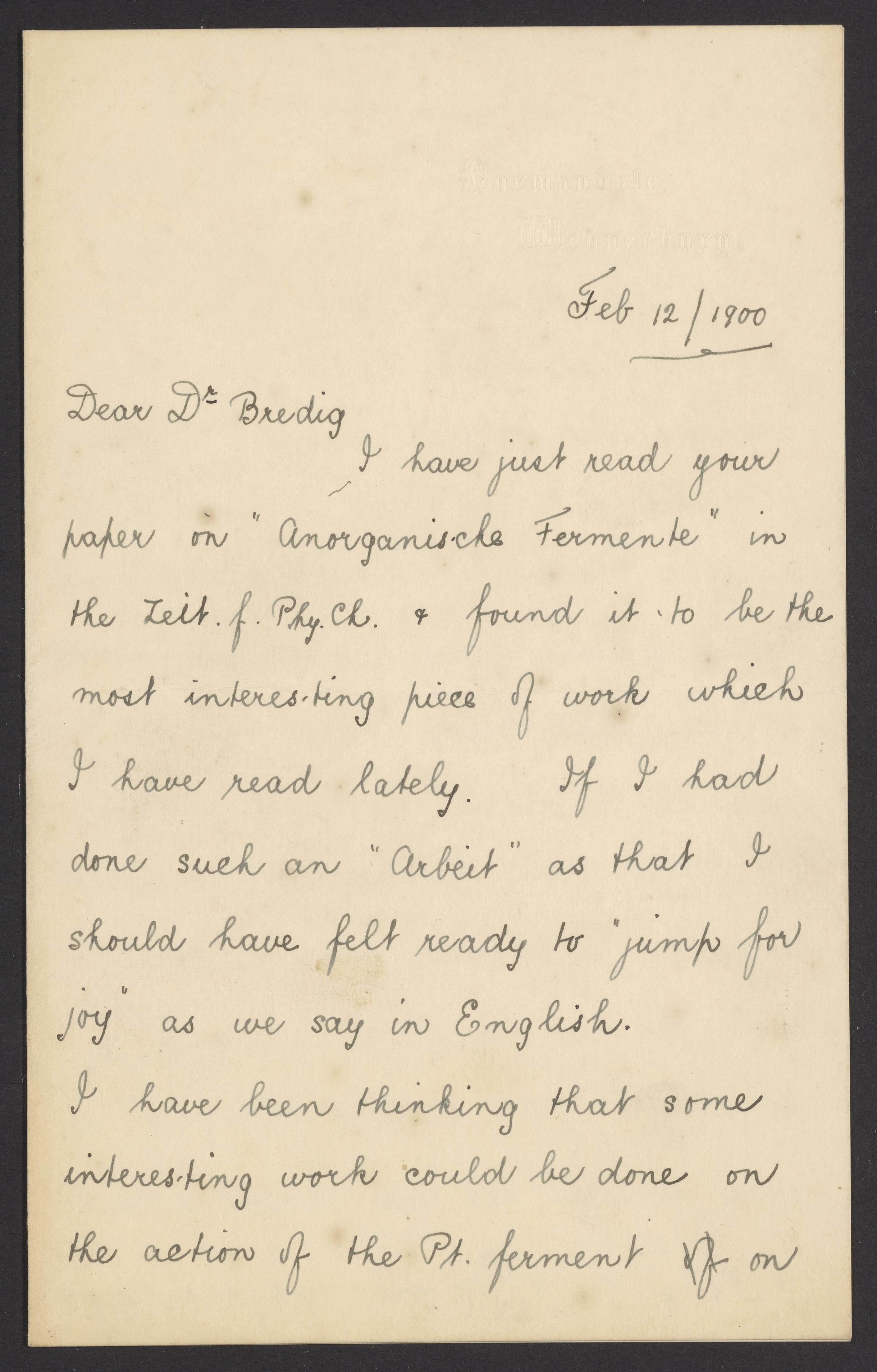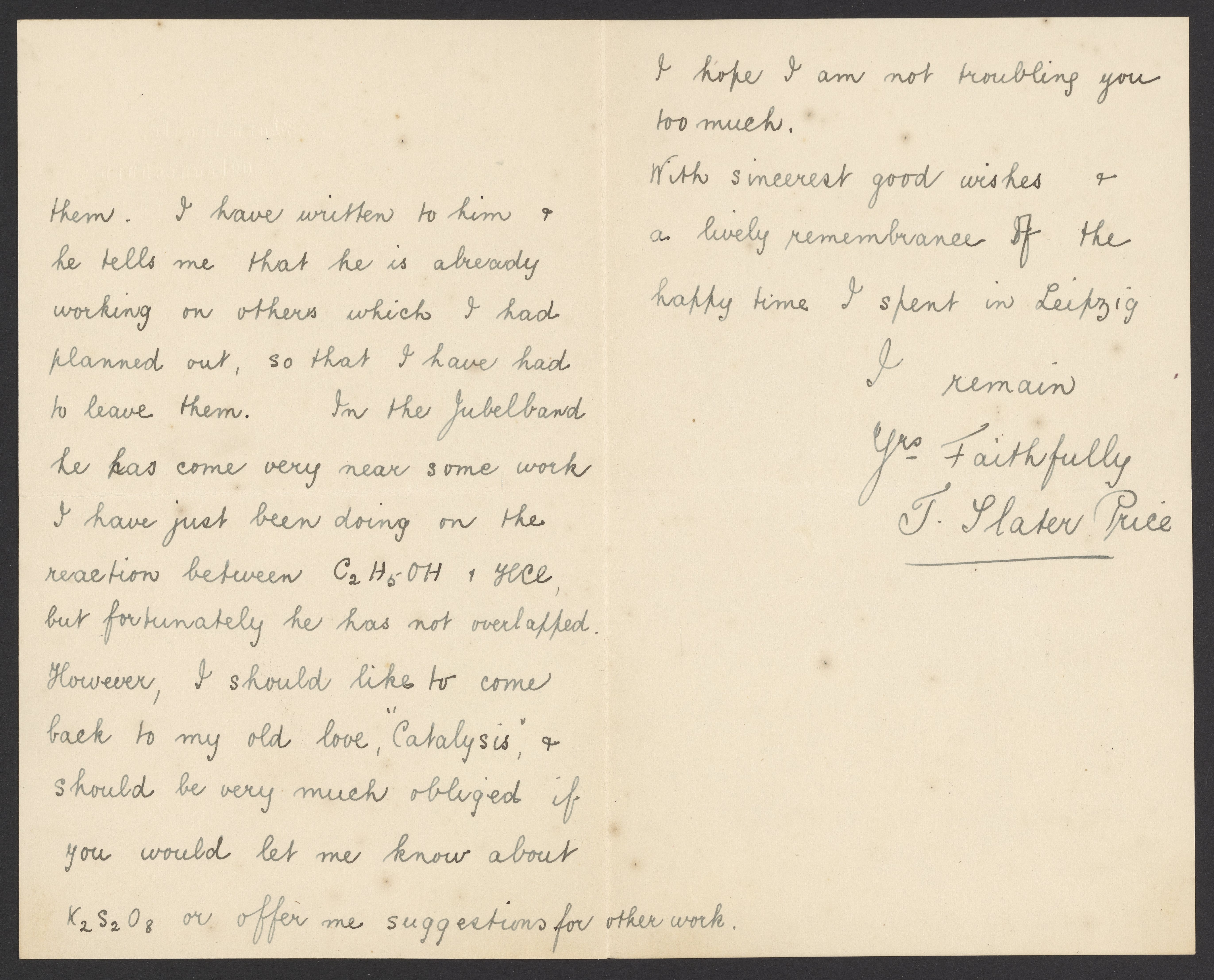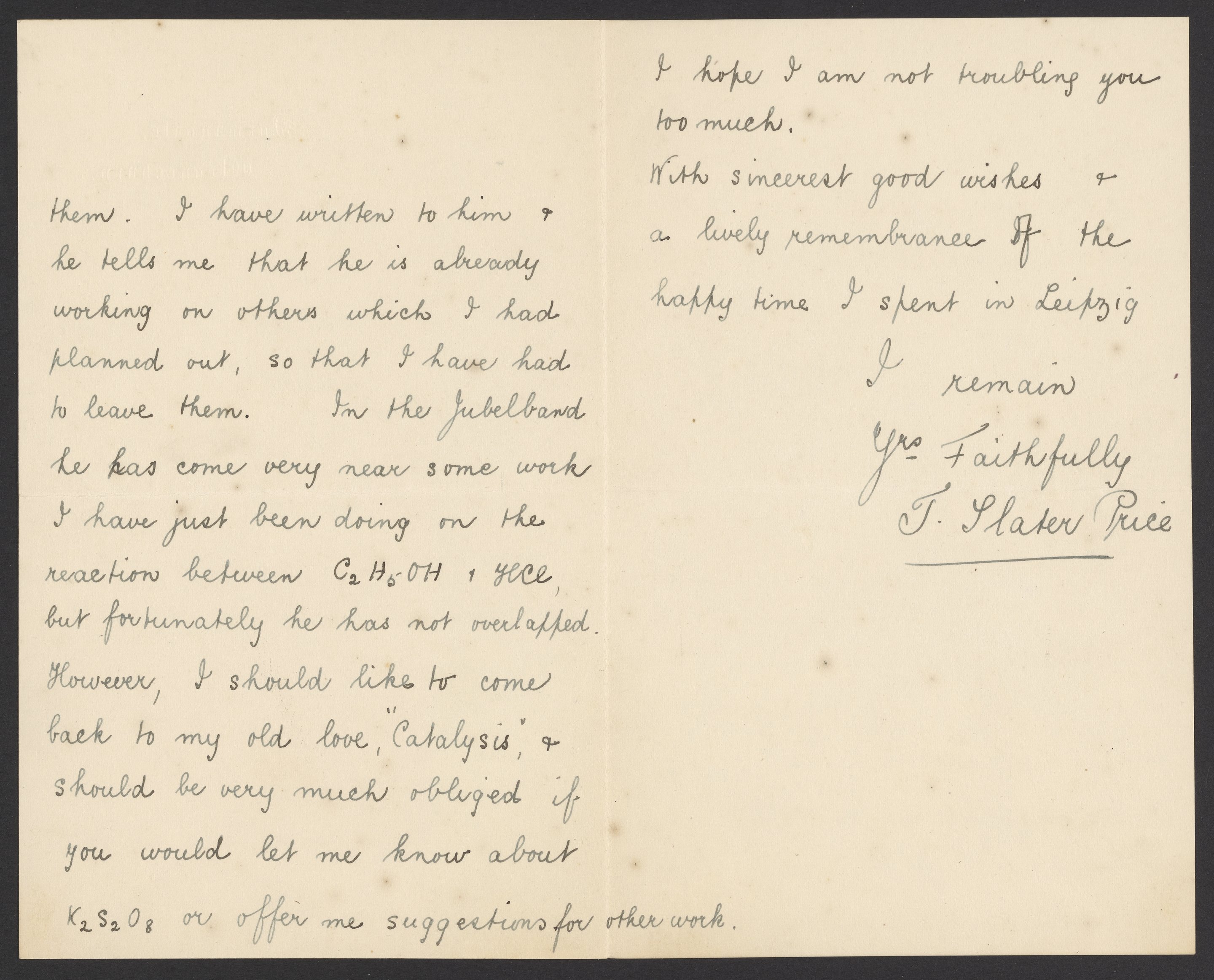 Letter from Thomas Slater Price to Georg Bredig