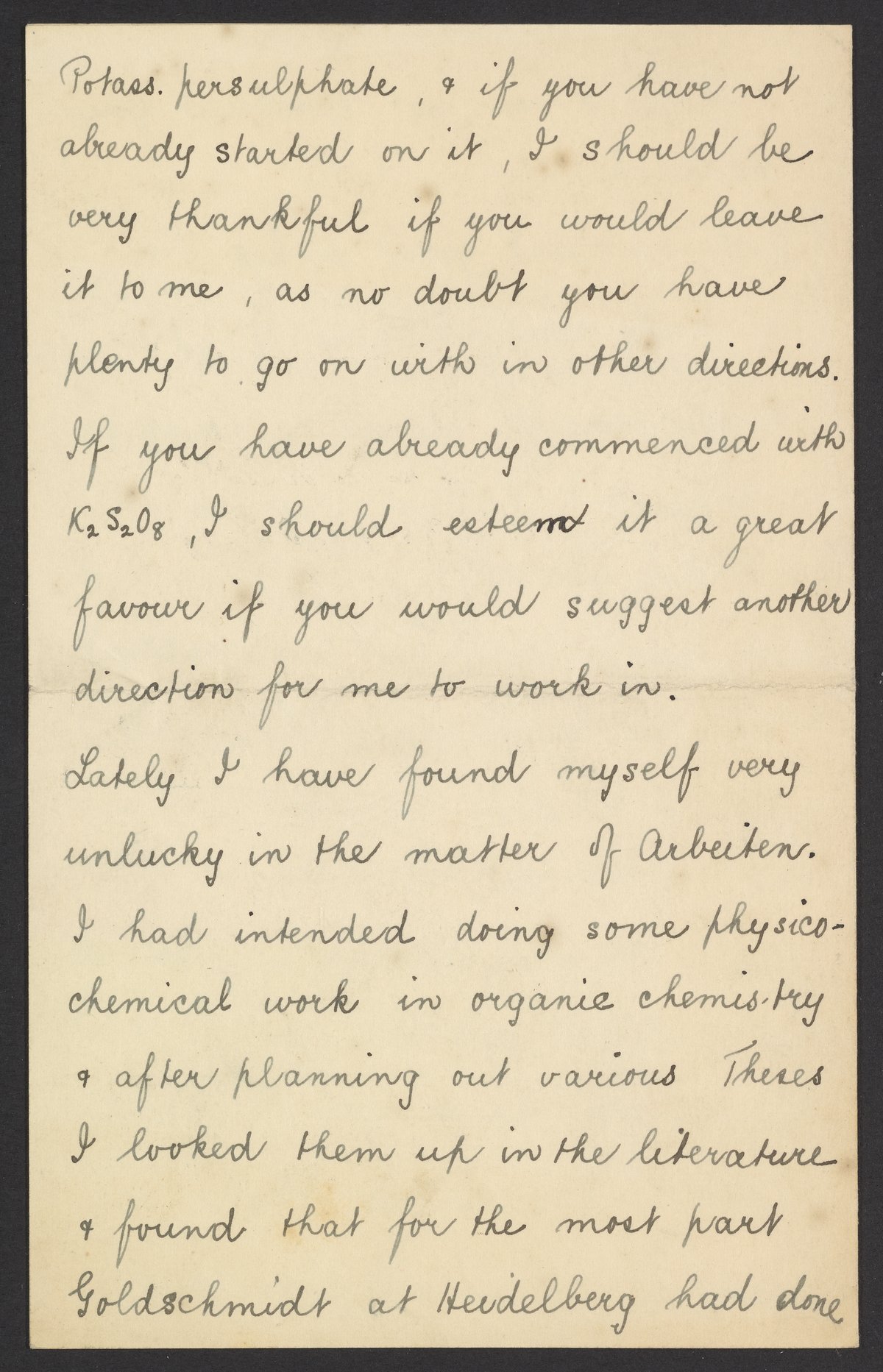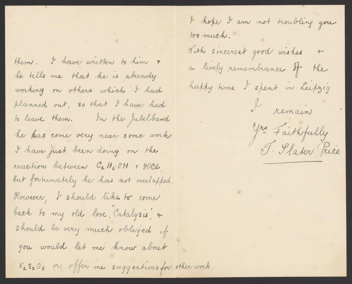 Small JPG1200 x 1877px — 252 KBFull-sized JPG2823 x 4416px — 1.3 MBOriginal fileTIFF — 2823 x 4416px — 35.7 MBLetter from Thomas Slater Price (1875-1949) to Georg Bredig (1868-1944). Price, a British chemist, expresses his interest in returning to work with catalysts and asks Bredig for advice.