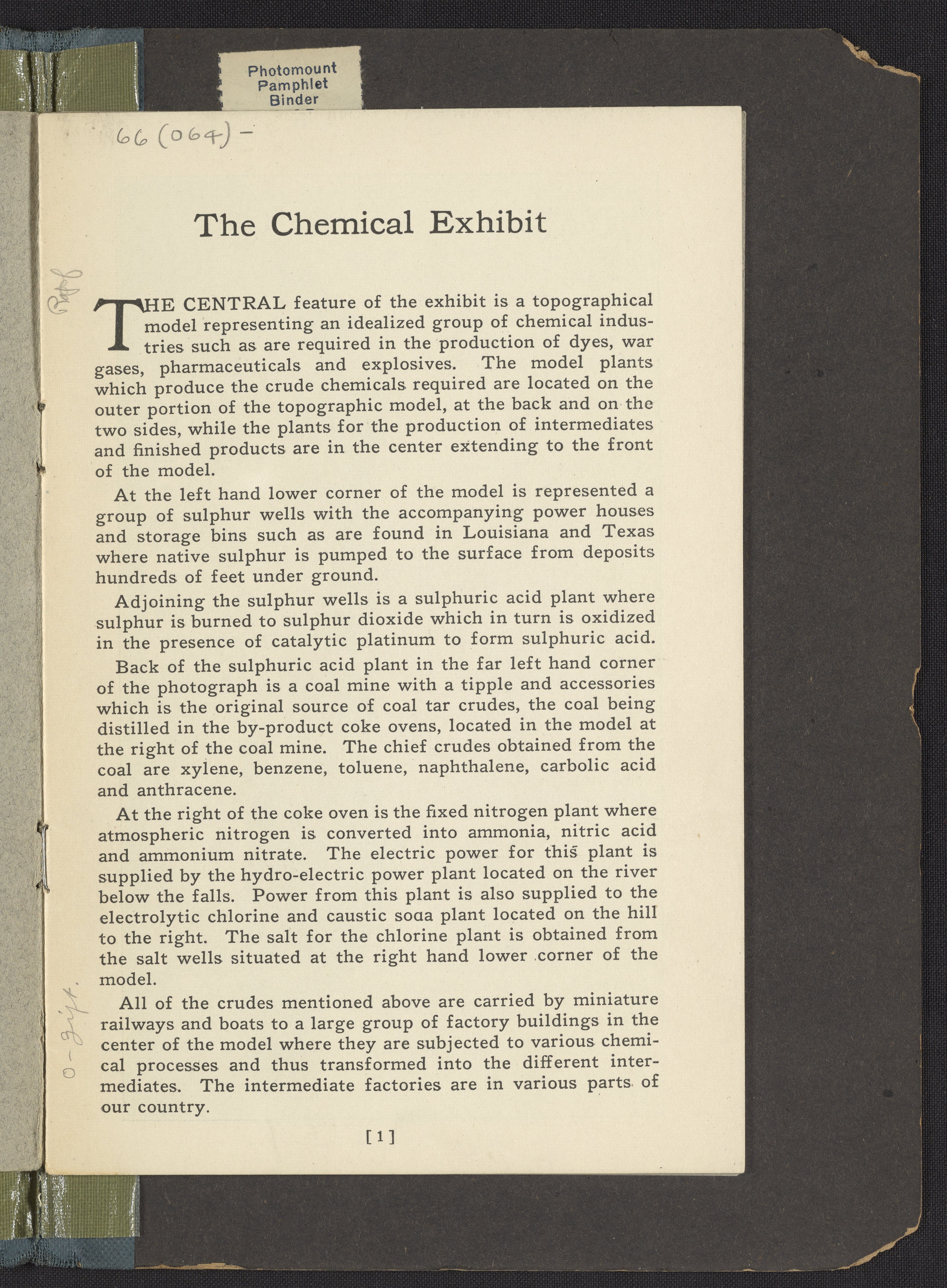 Small JPG1200 x 1631px — 442 KBLarge JPG2880 x 3916px — 2.7 MBFull-sized JPG4344 x 5906px — 5.7 MBOriginal fileTIFF — 4344 x 5906px — 73.5 MBExhibition program for "The Chemical Exhibit" installed at the Smithsonian Institute in Washington, D.C. circa 1921. The central feature of the exhibit is a topographical model showing coal tar and other chemical industries in the production of dyes, war gases, pharmaceuticals, and explosives. The program includes an overview of "Chemistry in National Welfare" by H. E. Howe, and discusses sulfur, coal, salt, and air products, as well as coal tar drugs and perfumes.