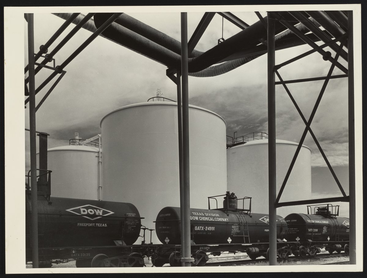 Dow Chemical Company. “Tank Cars at Dow Chemical Company Plant,” 1952. Dow Chemical Company Historical Image Collection, Box Oversized Plants 1. Science History Institute. Philadelphia. https://digital.sciencehistory.org/works/8p58pd41f.