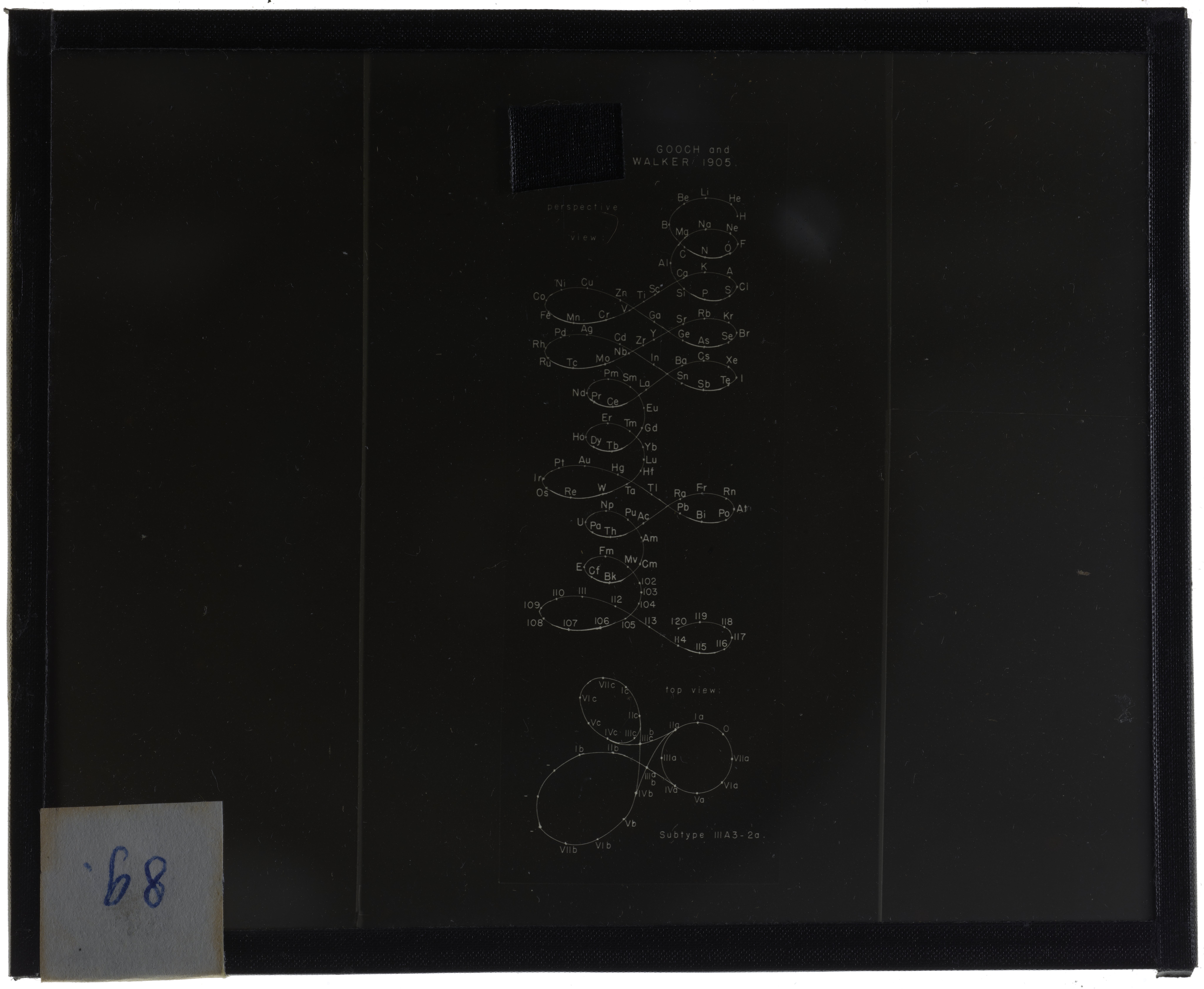 Walker, Claude Frederic, Edward G. Mazurs, and Frank Austin Gooch. “Periodic Table in Style of Helix and Space Lemniscate with Two Additional Loops for Rare Earth Elements.” Glass (material), circa 1905–1957. Edward G. Mazurs Collection of Periodic Systems Images, Box 2. Science History Institute. Philadelphia. https://digital.sciencehistory.org/works/8p58pd55s.