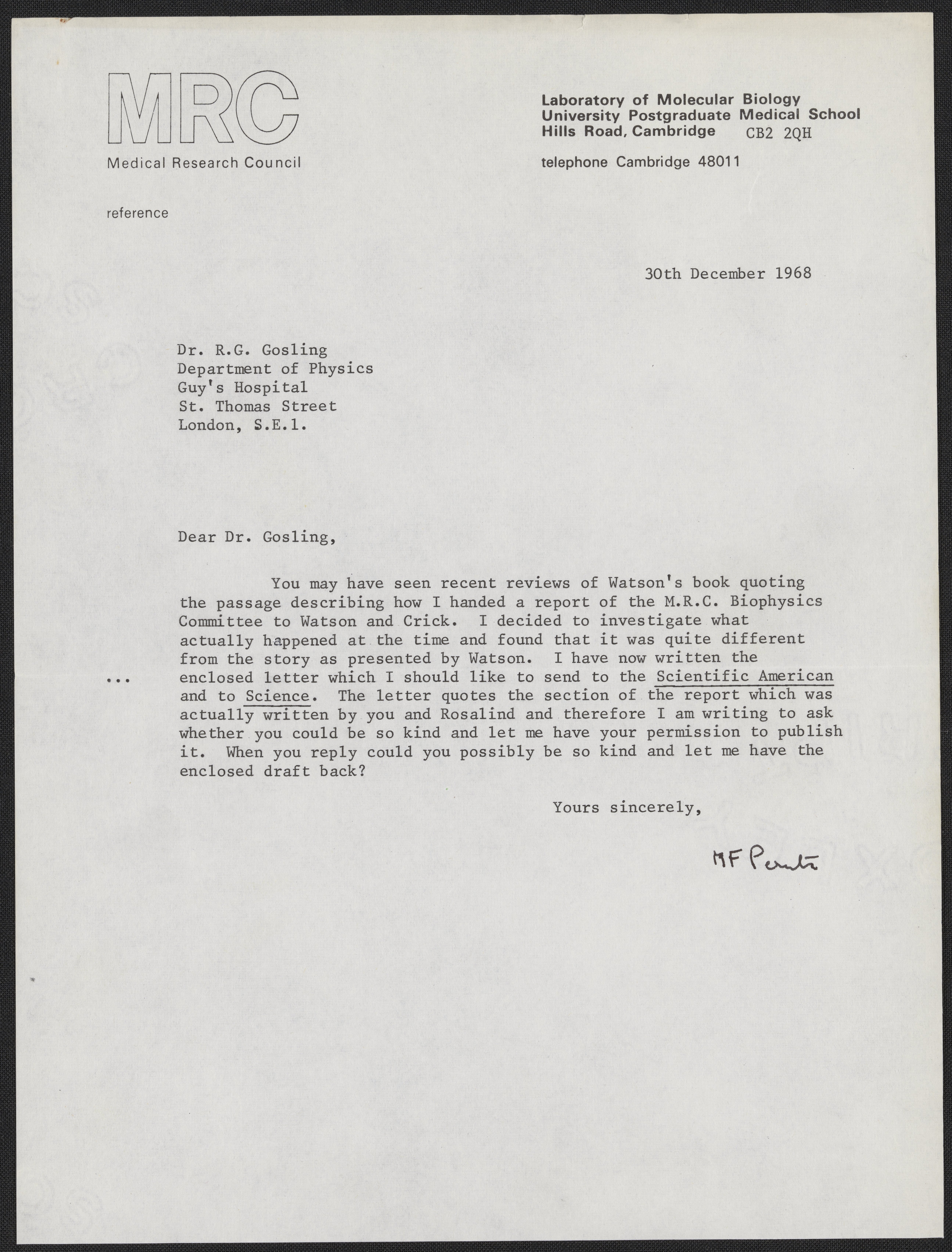 Letter from Max Perutz to Raymond Gosling, December 30, 1968