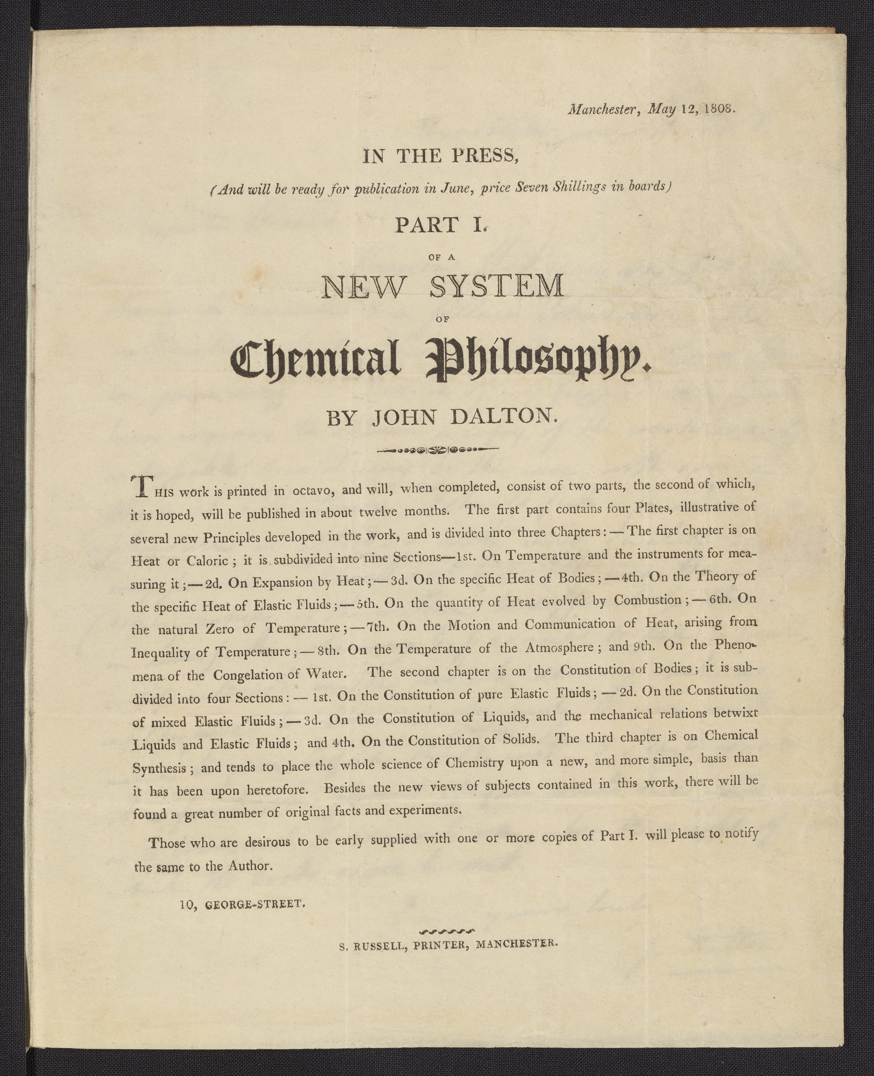 Small JPG1200 x 1477px — 306 KBLarge JPG2880 x 3544px — 1.8 MBFull-sized JPG5063 x 6231px — 5.2 MBOriginal fileTIFF — 5063 x 6231px — 90.3 MBProspectus announcing the publication of part I of John Dalton’s (1766-1844) immortal New System of Chemical Philosophy (Manchester, 1808). This copy contains an accompanying letter to Dr. John Bostock (1773-1846) from Dalton, who enquires if Bostock wishes to purchase a copy of his forthcoming book.
