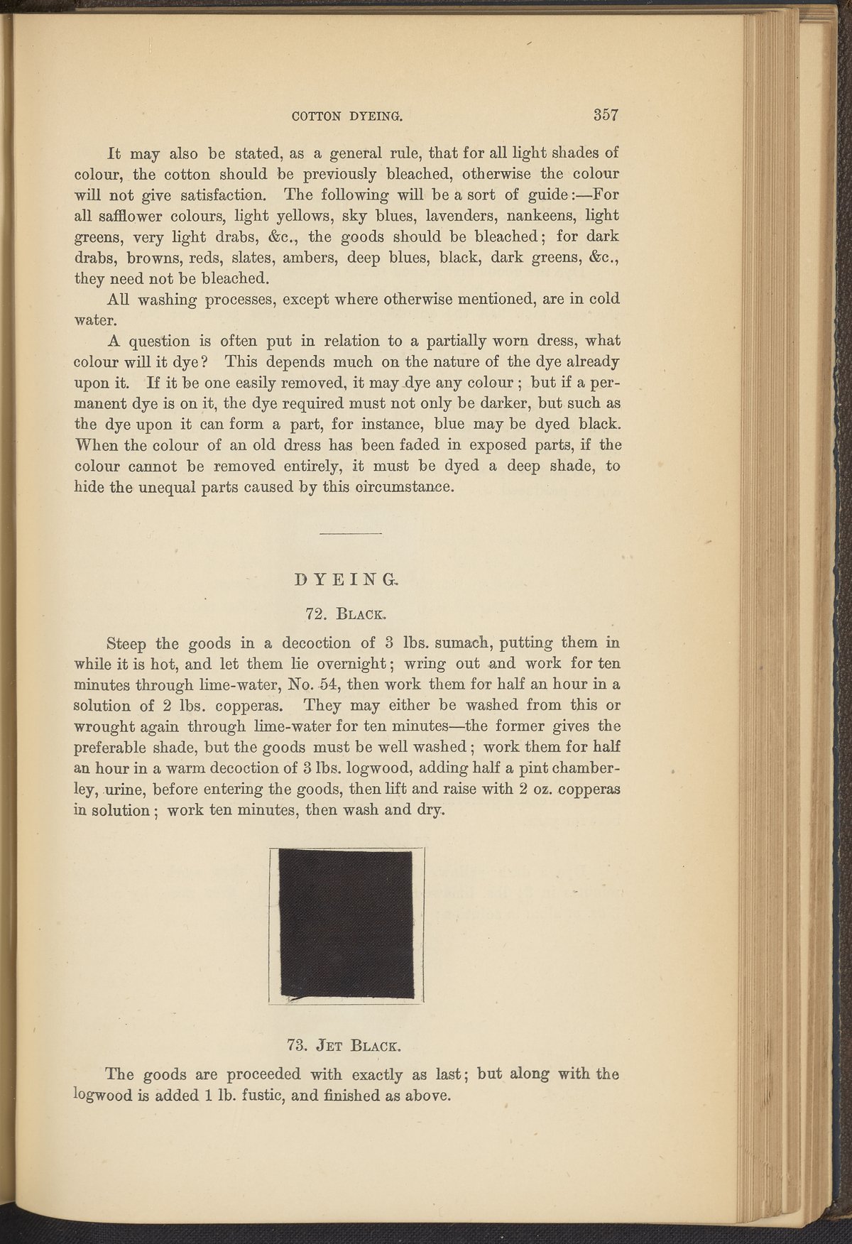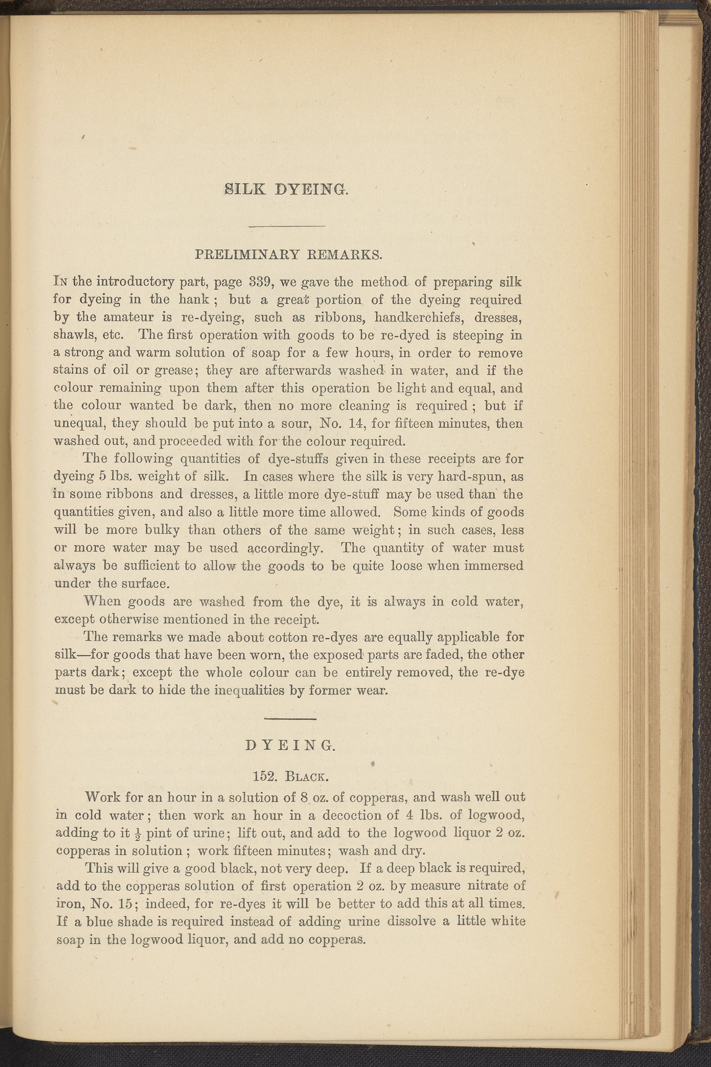 Small JPG1200 x 1694px — 624 KBFull-sized JPG2536 x 3579px — 2.3 MBOriginal fileTIFF — 2536 x 3579px — 26.0 MBThe third edition of a work, updated from the first to include an updated description of contemporary dyeing machinery, advances in science, and updated nomenclature and chemical formula. According to the author, the work is intended to aid the skilled workman, "not to teach practical dyeing, but to explain the scientific principles of the art." Includes numerous recipes for dyeing cotton, silk, and wool fabrics.