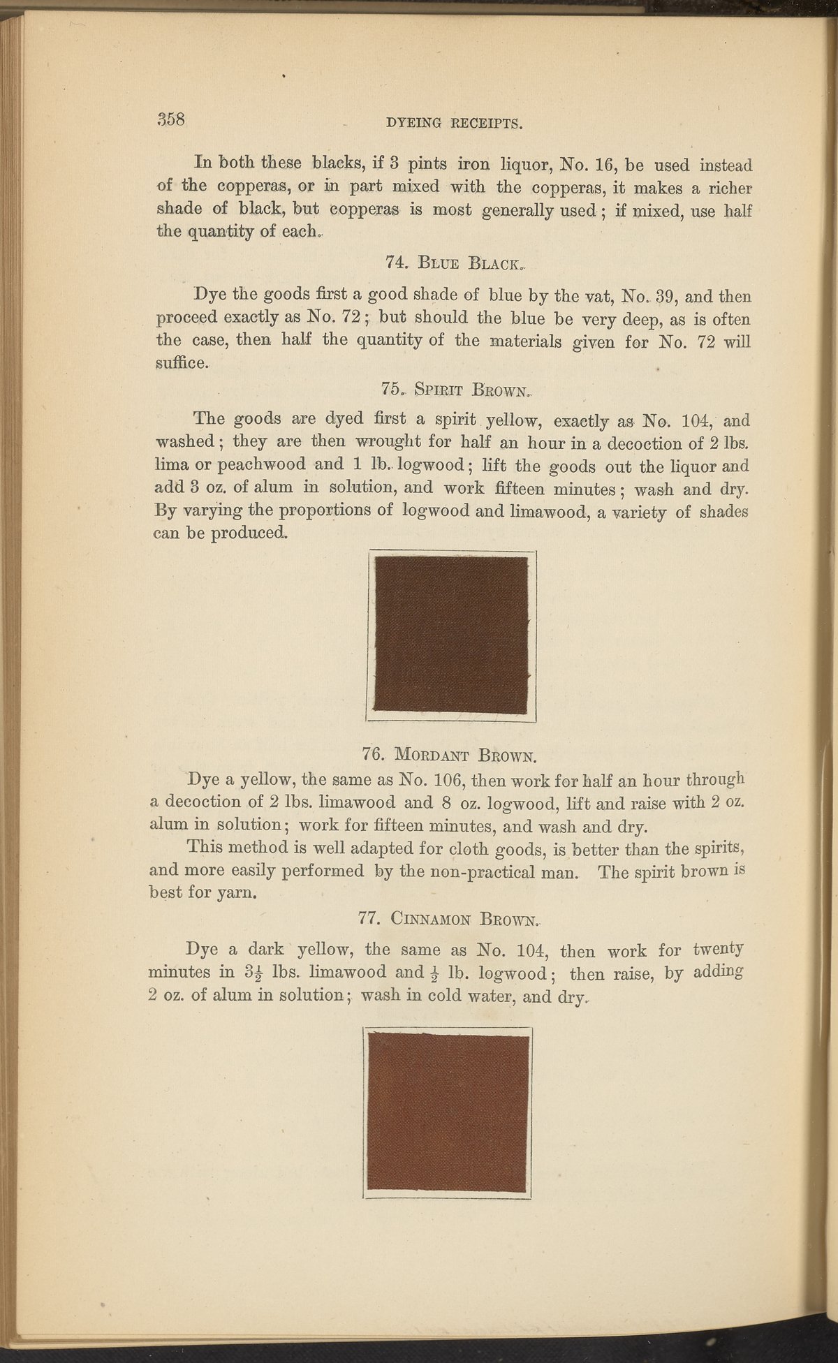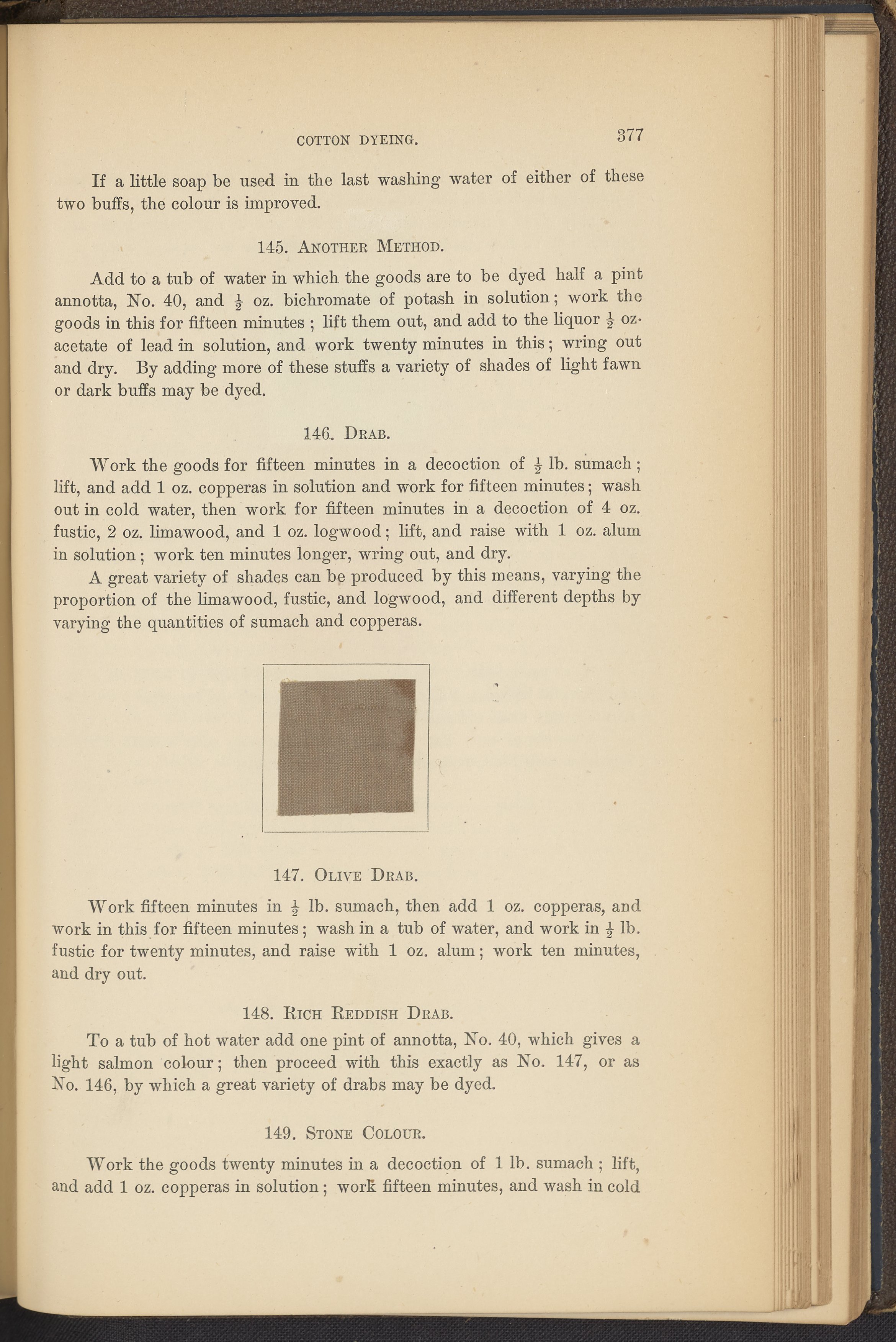 Digitization includes the work's front matter and pages 357-409 which contain pasted samples of dyed wool, silk, and cotton textiles.