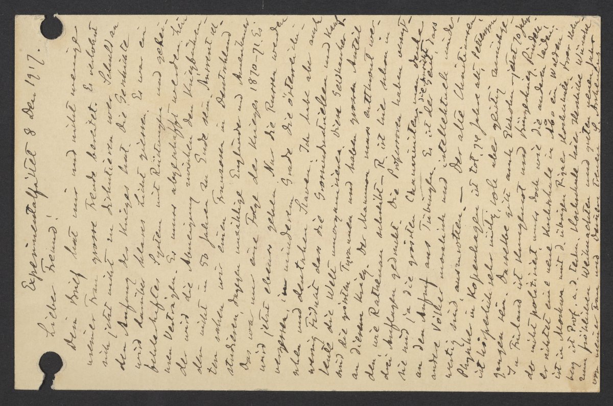 Dein Brief hat mir und nicht weniger meiner Frau grosse Freude bereitet. Es verlohnt sich jetzt nicht zu diskutieren wer Schuld an dem Anfang des Krieges hat. Die Geschichte wird darüber klares Licht giessen. Es war ein fehlerhaftes System mit Rüstungen und geheimen Verträgen. Es muss abgeschafft werden. Leider wird die Abneigung zwischen den Kriegsführenden nicht in 50 Jahren zu Ende sein. Aüsserst selten sahen wir einen Franzosen in Deutschland studieren, dagegen unzählige Engländer und Amerikaner. Das war uns eine Folge des Krieges 1870-71. Es wird jetzt ebenso gehen. Nur die Russen werden verzerren, in niederem Grade die österreichischen und deutsch Slaven. Ich habe aber auch wenig Fidant, dass die Grossindustriellen und Kaufleute die Welt umorganisieren. Diese Geldmacher sind die grössten Tyrannen und haben grossen Anteil an diesem Krieg. Der Mammon muss entthront werden, wie Rathenau schreibt. R ist hier schon in drei Anflugen gedruckt. Die Professoren haben versagt. Sie sind ja die grössten Chanceneinrichter, man denke an den Aufruf aus Tübingen. Es ist ^die Ansicht^ der Geist, dass andere Völker moralisch und intellektuell minderwertig sind, auszurotten. Der alte Christiansen, Physiker in Kopenhagen, ist tot, 74 Jahre alt. Pettersson ist sehr züchtig, soll aber geistig zurückgegangen sein. Dasselbe geht auch Ekholm – jetzt 70 Jahre. In Finnland ist Hungernot und Bürgerkrieg. Rindell, der nicht politisiert, muss doch wie die anderen leiden! Er richtet eine kleine Hochschule in Åbo ein. Walden ist in Moskau mit d. übrigen Rigaer Hochschule. Herr Holmberg ist Prof. a.d. Tech. Hochschule hier. Herzliche Wünsche zum fröhlichen Weihnachten und guten neuen Jahr von meiner Frau und Deinem treuen S. Arrhenius